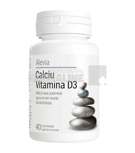 DescriereCacliu si Vitamina D3 sunt necesare pentru mentinerea sanatatii sistemului osos. Calciu contribuie la metabolismul energetic normal si la o neuritransmisie normala. De asemenea contribuie la metabolismul macronutrientilor si la functionarea sistemului nervos. Vitamina D3 contribuie la absorbtia normala a calciului.Efecte:- Pentu mentinerea sanatatii sistemului osos (Calciu si Vitamina D3);- Contribuie la o neurotransmisie normala (Calciu);- Contribuie la functionarea normala a enzimelor digestive (Calciu);- Contribuie la coagularea normala a sangelui (Calciu);- Pentru mentinerea sanatatii dintilor (Calciu si Vitamina D3);- Contribuie la functionarea normala a sistemului muscular (Calciu si Vitamina D3).CompozitieCalciu (carbonat de calciu 1250mg) 500mg, Vitamina D3 (5μg) 200 U.I.Mod de administrareCate 1 comprimat de 2 ori pe zi. Cure de 10 – 15 zile pe luna.ProducatorAleviaMod de prezentareFlacon 40 comprimate