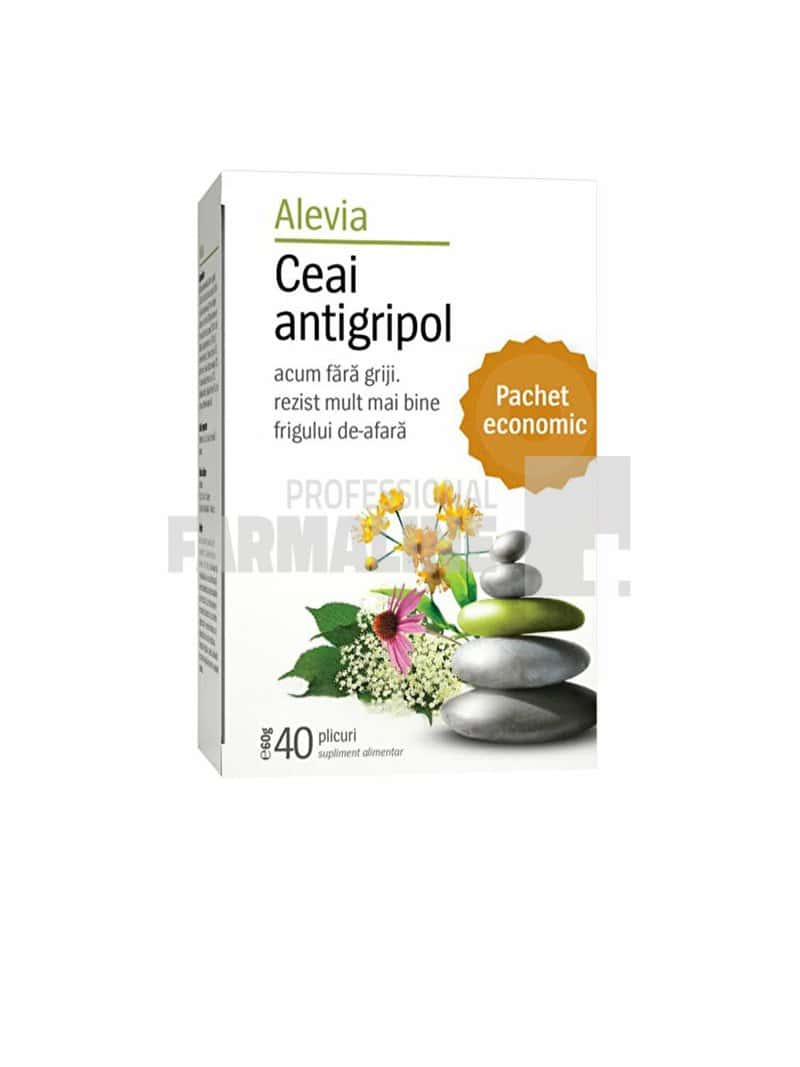 DescriereLuptă împotriva răcelii și gripei.- Contribuie la reducerea manifestărilor asociate răcelii- Contribuie la funcționarea normală a sistemului imunitar.CompozitieRădăcini de Lemn-dulce (Glycyrrhiza glabra) 18,57%, flori de Soc (Sambucus nigra) 15%, flori de Tei (Tilia tomentosa) 12%, flori de Mușețel (Matricaria chamomilla) 7,58%, părți aeriene de Echinacea (Echinacea purpurea) 7,57%, fructe de Cătină (Hippophae rhamnoides) 7,57%, părți aeriene de Cimbrișor (Thymus serpyllum) 7,57%, părți aeriene de Sovârv (Origanum vulgare) 7,57%, flori de Lumânărică (Verbascum sp.) 7,57%, rădăcini de Ghimbir (Zingiber officinale) 5%, fructe de Anason (Pimpinella anisum) 4%.Mod de administrareUz intern: ceai, 1 pliculeț/cană, se infuzează 3 – 5 minute.ProducatorAleviaMod de prezentareCutie cu 40 plicuri