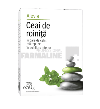 DescriereRecomandat ca adjuvant in:- Stres, insomnii, nervozitate, anxietate, atac de panica, depresie, dureri de cap, migrene si vertij;- Balonare, colici, greata.Efecte:- Ajuta la inducerea relaxarii si a starii de bine, a confortului psihic, calmului si echilibrului;- Sustine somnul profund si odihnitor;- Efect benefic in scaderea simptomelor asociate stresului;- Ajuta la mentinerea unei stari pozitive si a sanatatii mentale;- Sprijina procesul de purificare a organismului;- Ajuta digestia;- Contribuie la sanatatea sistemului circulator si respirator;- Ajuta la mentinerea echilibrului hormonal.CompozitieFrunze de Roinita (Melissa officinalis) 100%.Mod de administrare2 – 3 cani pe zi.UZ INTERN: ceai. Infuzie din 1 lingurita de planta la 1 cana cu apa clocotita, se lasa acoperit 5 – 7 minute.  ProducatorAleviaMod de prezentareCutie 50 g