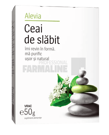 DescriereMentine greutatea optima consumand ceai de slabit.Recomandat ca adjuvant în:- Obezitate, cure de slăbire;- Detoxifiere;- Celulită.CompozitieFrunze de Senna (Cassia senna) 25%, frunze de Ceai-verde (Camellia sinensis) 25%, flori de Soc (Sambucus nigra) 20%, părți aeriene de Mentă (Mentha piperita) 15%, frunze de Păpădie (Taraxacum officinale) 15%.Mod de administrareInfuzie din 1 – 2 lingurițe de plante la 1 cană de apă clocotită, se lasă acoperit 5 – 7 minute.Se beau 3 – 4 căni înainte de mesele principale (până la ora 18:00). O cură durează 3 luni, după care se face pauză 1 lună, apoi se poate reîncepe o altă cură de 3 luni.ProducatorAleviaMod de prezentareCutie 50 g