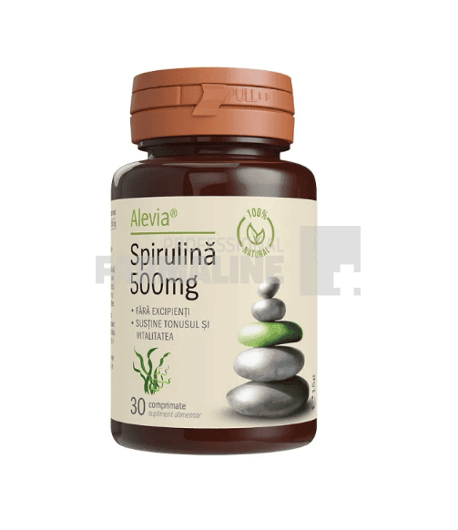 DescriereDatorită compoziției sale bogate în proteine, vitamine, minerale, acizi grași esențiali, spirulina reprezintă cel mai concentrat aliment vegetal. Este un excelent detoxifiant și revigorant pentru organism.• Susține relaxarea, starea de bine, calmul și confortul psihic;• Susține tonusul fizic și psihic și imunitatea organismului;• Favorizează senzația de sațietate dacă este administrată cu 30 de minute înainte de masă.• Încetinește procesele de îmbătrânire• Ajută organismul în bolile cronice: cardiace, pulmonare , hepatice.CompozitieSpirulină (Spirulina plantesis) 500mg.Mod de administrareAdulți: câte 2 comprimate de 2- 3 ori pe zi.Copii: câte ½ comprimat de 3 ori pe zi.Se urmează cure de minim 3 luni.ProducatorAleviaMod de prezentareFlacon cu 30 comprimate