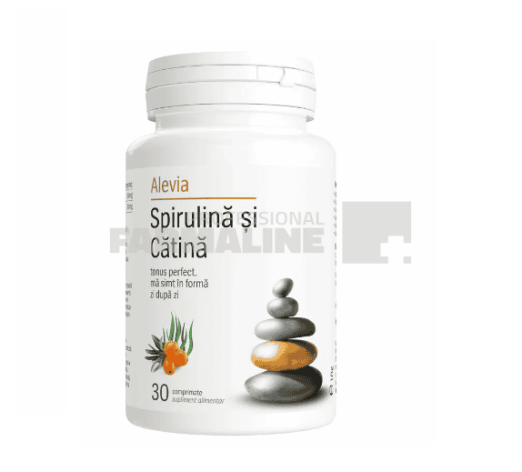 DescriereSpirulina este ce mai cunoscută algă verde-albastră, importantă sursă de clorofilă, vitamine (mai ales B12), aminooacizi, minerale (îndeosebi calciu) și acizi grași Omega-3, 6 și 9, sigură pentru consumul uman și cu multiple acțiuni favorabile pentru sănătate iar fructele de Cătină sunt cunoscute pentru numeroasele sale proprietăți.Remineralizează și vitalizează organismulExtractul de cătină ajută la întărirea sistemului imunitarCătina cea mai bogată sursă de vitamine A, E, carotenoizi, vitaminele C, P și întreg complexul B), microelemente bioactive (fosfor, calciu, fier, magneziu, potasiu) și acizi grași esențiali.Păstrează tonusul și vitalitateaSusține controlul greutățiiSusține stare de bine în convalescență și efort intensSusține rezistență sistemului cardiacElimină obosealaCompozitiePulbere de Spirulină 350mg, standardizată 65% proteine, extract 10:1 din fructe de Cătină 150mg, celuloză microcristalină, lactoză monohidrat, dioxid de siliciu coloidal, stearat de magneziu vegetal.Mod de administrareCopii între 7 și 15 ani: câte 1 comprimat de 3 ori pe zi.Adulți și tineri de peste 15 ani: câte 1-3 comprimate de 3 ori pe zi.ProducatorAleviaMod de prezentareFlacon 30 comprimate