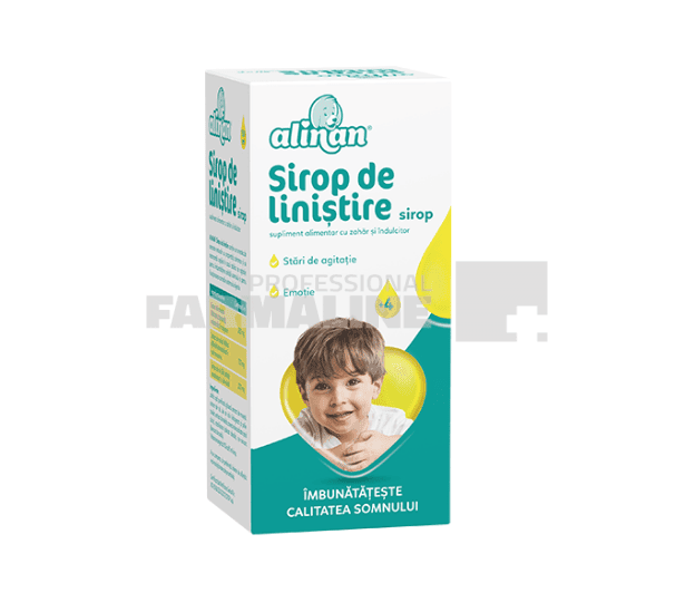 DescriereAlinan® Sirop de linistire este un preparat obținut din extracte naturale standardizate, cu proprietăți calmante, recomandat copiilor în cazul stărilor de agitație, pentru îmbunătățirea calității somnului și pentru funcționarea normal a sistemului digestiv.Indicatii- Agitatie, imbunatatirea calitatii somnului;- Pentru functionarea normala a sistemului digestiv: pentru reglarea tranzitului intestinal, balonari, crampe abdominale.Avantaje- Contribuie la funcționarea normală a sistemului digestiv;- Ajută la reglarea tranzitului intestinal;- Ameliorează balonările și crampele abdominaleCompozitieIngrediente: zahăr, apă purificată, glicerol, extract de muşeţel, extract de tei, ulei de ricin hidrogenat şi polietoxilat, extract de melisă, corector de aciditate (acid citric), stabilizator (edetat disodic), conservant (benzoat de sodiu).Mod de administrareIn stari de agitatie:- Copii 4-6 ani: 5 ml sirop (1 lingurita) de 2 ori pe zi;- Copii 7-12 ani: 5 ml sirop (1 lingurita) de 3 ori pe zi;Pentru functionarea normala a sistemului digestiv (reglarea tranzitului intestinal, balonari, crampe abdominale):- Copii 4-6 ani: 5 ml sirop (1 lingurita) de 2 ori pe zi;- Copii 7-12 ani: 5 ml sirop (1 lingurita) de 3 ori pe zi.Pentru imbunatatirea calitatii somnului se administreaza seara , cu 30 minute inainte de culcare:- Copii 4-6 ani : 5 ml sirop (1 lingurita) pe zi;- Copii 7-12 ani : 10 ml sirop (2 lingurite) pe zi;ProducatorFiterman Pharma Mod de prezentareFlacon 150 ml