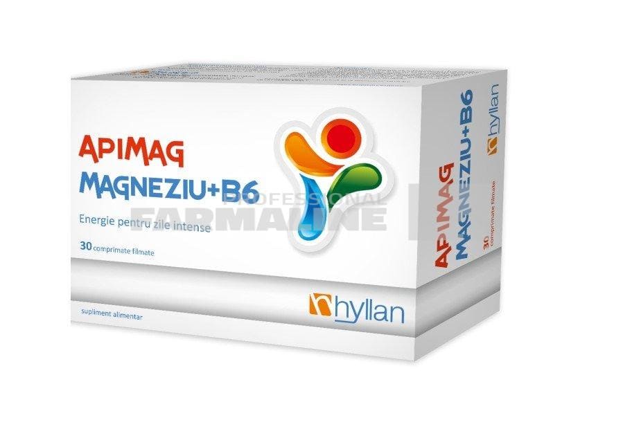 DescriereMagneziul, un mineral ce se gaseste din abundenta in organism, este prezent in multe alimente. Rolurile sale in organism sunt numeroase si importante. Este cofactor in peste 300 de sisteme enzimatice, care regleaza diferite procese biochimice, inclusiv sinteza proteinelor, functionarea sistemului muscular si a celui nervos, controlul nivelului glucozei in sange si reglarea tensiunii arteriale.Vitamina B6 sustine asimilarea si actiunea magneziului in organism.ApiMag Magneziu + B6 contribuie la functionarea normala a sistemului nervos si la reducerea starilor de oboseala si stres. ApiMag Magneziu + B6 este util persoanelor active, cu un stil de viata care implica solicitari frecvente fizice si mentale. Prin continutul sau de vitamina B6, ApiMag Magneziu + B6 contribuie la formarea normala a globulelor rosii, functionarea normala a sistemului imunitar si reglarea activitatii hormonale.CompozitieMagneziu 100 mg, Vitamina B6 10 mg.Mod de administrareAdulti: 2 – 3 comprimate filmate pe zi, fractionat in 2 – 3 prize, administrate in timpul meselorCopii peste 6 ani, 1 comprimat pe zi (sau conform recomandarii medicului ori a farmacistului) Se administreaza pe cale orala.ProducatorHyllan PharmaMod de prezentareCutie 30 comprimate