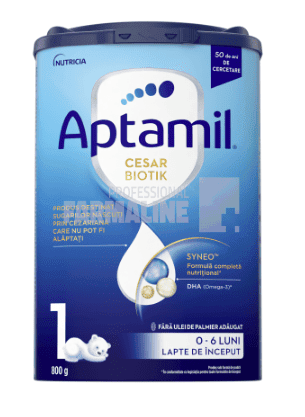 DescriereInspirați din cercetările noastre științifice, am dezvoltat Aptamil CESARBIOTIK 1, formula noastră potrivită bebelușilor născuți prin cezariană care nu pot fi alăptați.Formulă completă nutrițional*, Aptamil CESARBIOTIK 1 conține: • SYNEO™ • DHA (Omega-3)**În conformitate cu legislația pentru toate formulele de început Aptamil® CESARBIOTIK 1 nu conține ulei de palmier adăugat.Ambalajul formulei Aptamil CESARBIOTIK 1 este prietenos cu mediul, fiind creat parțial din materiale regenerabile pe bază de plante. Fabrica noastră folosește energie electrică provenind din surse 100% regenerabile.Întrucât, pentru noi, fiecare pas mic contează. Împreună, creăm un viitor mai bun pentru copilul tău!CompozitieLactoză (din lapte de vacă), uleiuri vegetale (ulei de floarea-soarelui bogat în acid oleic, ulei de cocos, ulei de rapiță, ulei de floarea-soarelui), lapte de vacă degresat, zer demineralizat (din lapte de vacă), galactooligozaharide (din lapte de vacă), concentrat din zer (din lapte de vacă), proteină din lapte de vacă, fructooligozaharide, ulei de pește, fosfat tricalcic, clorură de potasiu, ulei din Mortierella alpina, citrat de sodiu, 2’Fucozillactoză (2′-FL), clorură de colină, citrat de potasiu, clorură de magneziu, acid L-ascorbic, magneziu hidrogen fosfat, emulsifiant (lecitine (soia)), taurină, inozitol, Bifidobacterium breve, sulfat feros, sulfat de zinc, uridină 5′-monofosfat de sodiu, 5′-monofosfat citidină, antioxidant (ascorbil palmitat), 5′-monofosfat adenozină, inozină 5′-monofosfat de sodiu, L-carnitină, nicotinamidă, D-pantotenat de calciu, guanozină 5′-monofosfat de sodiu, sulfat de cupru, DL-alfa-tocoferil acetat, retinil palmitat, riboflavină, hidroclorură de tiamină, hidroclorură de piridoxină, iodurăde potasiu, acid pteroilmonoglutamic, sulfat de mangan, selenit de sodiu, fitomenadionă, colecalciferol, D-biotină, cianocobalamină. Mod de administrare1. Spală-te bine pe mâini, sterilizează toate ustensilele utilizate în prepararea formulei de lapte și asigură-te că marginea ambalajului este curată.2. Fierbe apa potabilă pentru prepararea formulei de lapte timp de 5 minute, apoi lasă la răcit până la cca 40 °C. Toarnă în recipientul pregătit (biberon) cantitatea de apă fiartă şi răcită, necesară conform dozării pentru o masă.3. Dozează pudra cu lingurița din capacul ambalajului, nivelată cu ajutorul marginii din interiorul cutiei. Adaugă pudra conform tabelului de dozare în recipientul pregătit (biberon).4. Închide recipientul şi agită vertical și viguros timp de 10 secunde. Este foarte important să respecți modalitatea și timpul de agitare pentru a dizolva corect pudra.5. Verifică pe încheietura mâinii tale temperatura formulei de lapte preparate (cca 37 °C).INDICAȚII IMPORTANTEAceasta este o formulă instant. Produsul este adecvat pentru alimentația specială a sugarilor, de la naștere, dacă nu sunt alăptați. Întotdeauna prepară laptele chiar înainte de masă şi hrănește copilul imediat. Produsul preparat şi nefolosit va fi aruncat. Ai grijă de igiena orală a copilului tău, mai ales înainte de culcare. Întotdeauna respectă cu strictețe atât dozarea, cât şi modul de preparare a hranei, recomandate. Prepararea și depozitarea greșite pot afecta sănătatea copilului. Nu fierbe formula și nu folosi cuptorul cu microunde pentru a prepara sau încălzi formula (pericol de supraîncălzire). Încălzirea poate limita proprietățile Bifidobacterium breve. Nu refolosi apa fiartă și răcită.DEPOZITAREA ÎNAINTE DE DESCHIDEREProdusul, ambalat în atmosferă protectoare, trebuie păstrat etanș și depozitat într-un loc uscat și răcoros (