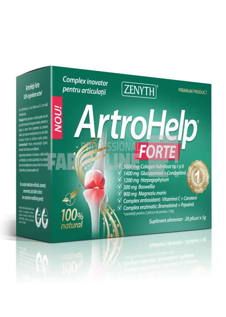 DescriereArtroHelp Forte este un produs inovator, cel mai avansat produs pentru articulatii de la Zenyth, care asigura ingrijirea completa a tuturor articulatiilor: coloana vertebrala, mana, umar, sold, genunchi. Cu ingrediente de ultima generatie, optim dozate, ArtroHelp Forte actioneaza deopotriva pentru mentinerea elasticitatii si flexibilitatii articulatiilor, cat si pentru reducerea disconfortului articular.CompozitieColagen hidrolizat de tip I si II – 5000 mg, Glucozamina si condroitina – 1400 mg, Harpagophytum + Boswellia – 1500 mg, Magneziu marin – 900 mg, Complex antioxidant: Vitamina C + Caroteni, Complex enzimatic: Bromelaina + Papaina.Mod de administrareArtroHelp Forte se administreaza inainte sau dupa masa, in 150-200 ml apa, suc de fructe, smoothie-uri, shake-uri. Pentru rezultate optime, produsul se utilizeaza timp de 3-6 luni.Doza uzuala: 1-2 plicuri/zi, luate odata sau fractionat. Cure intensive (in traumatisme, accidentari, meteosensibilitate): 3-4 plicuri/zi, fractionat, timp de 1-2 saptamani. Doza maxima: 4 plicuri/zi.ProducatorZenyth PharmaceuticalsMod de prezentareCutie cu 28 plicuri