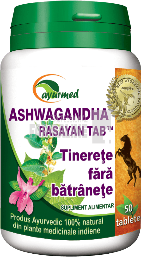 DescriereSuplimentul alimentarAshwagandha Rasayan este un tonic general complet, obtinut dintr-un amestec de plante medicinale indiene cunoscute pentru proprietatile lor de revigorare, regenerare si tonifiere, mentinand nivelul de energie din organism. Withania somnifera (ginseng indian) sustine capacitatea organismului de a mentine homeostazia si vitalitatea si ajuta la refacerea fizica si psihica dupa stari de oboseala si stres. Sustine echilibrarea sistemului imunitar si sistemul antioxidant endogen, contribuind asfel la mentinerea capacitatii naturale de autoaparare si refacere a organismului . Ashwaganda Rasayan Tab contribuie la relaxarea psihica, aparitia si mentinerea calitatii somnului, mentinerea capacitatii de concentrare, memorare si functionare normala a sistemului nervos in situatii de stres, surmenaj, suprasolicitare fizica si intelectuala. Radacina de Withania somnifera (Ginseng indian) are proprietatea de a proteja celulele creierului impotriva efectelor nocive ale stilului de viata modern. Studiile de specialitate efectuate de-a lungul timpului au relevat eficienta plantei in inhibarea cresterii mai multor tipuri de tumori. Fitonutrientii din plante sustin organismul impotriva imbatranirii premature prin mentinerea echilibrului fizic, hormonal, psiho-emotional si eliminarea pe cale naturala a toxinelor din organism.Contribuie la: – mentinerea tonusului general al organismului in conditii de suprasolicitare fizica si psihica sau in perioadele de convalescenta.- mentinerea capacitatii naturale de autoaparare si refacere a organismului.- relaxarea psihica, aparitia si mentinerea calitatii somnului, mentinerea capacitatii de concentrare si memorare.- revigorarea, regenerarea, tonifierea organismului si mentinerea nivelul de energie din organism.CompozitieWithania somnifera (Ginseng indian) pulbere de radacina 300 mg, Chlorophytum arundinaceum (Safed musli) pulbere de radacina 100 mg, Asparagus racemosus (Shatavari) pulbere de radacina 50 mg, Acacia arabica (guma acacia- excipient).Mod de administrareCopii peste 14 ani: ½ tableta de 3 ori pe zi, Adulti: 1-2 tablete de 3 ori pe zi. Se administreaza cu ½ ora inainte de masa minim 1 luna, cura de 3 luni.ProducatorAyurmedMod de prezentareFlacon 50 tablete