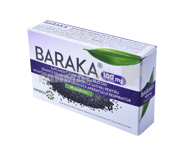 DescriereBaraka contine uleiul obtinut din presarea semintelor de Nigella sativa (chimen negru), o planta cu o larga raspandire in bazinul mediteranean si amintita din antichitate pentru proprietatile sale curative.Uleiul semintelor de chimen negru contine acizi grasi saturati si nesaturati, uleiuri volatile, vitamine, aminoacizi, enzime si saruri minerale, saponine si nigellone (substante specifice plantei Nigella sativa).Baraka (ulei de chimen negru) este folosit in mod traditional pentru a creste capacitatea de aparare a organismului fata de boli atat la copii cat si la adulti.Baraka este un supliment benefic persoanelor cu tuse persistenta, restanta dupa raceli sau viroze si persoanelor cu o sensibilitate pronuntata a aparatului respirator si care racesc frecvent, precum si la astmatici si fumatori.Prin componentele antioxidante, calmante si nutritive din uleiul de chimen negru, Baraka asigura un suport optim pentru cresterea imunitatii la copii si adulti si calmeaza tusea iritativa.CompozitieUleiul semintelor de chimen negru contine acizi grasi saturati si nesaturati, ulei volatil, vitamine, enzime si saruri minerale, saponine si nigelone (substante specifice plantei Nigella sativa).Modde administrarePentru cresterea capacitatii de aparare anti-infectioasa si ca antioxidant: 3-4 capsule pe zi continuu timp de o luna sau in cure periodice de 10 zile pe luna, 3-6 luni consecutiv;Ca antitusiv:3 capsule pe zi, 5-7 zile.ProducatorPharcoModde prezentareCutie cu 24 capsule moi