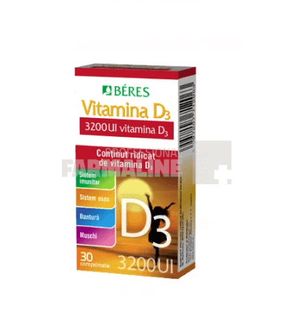 Descriere- contribuie la menținerea sănătății sistemului osos;- ajuta in absorbția calciului și fosforului;- adjuvant in menținerea sănătății dinților;- contribuie la menținerea concentrațiilor normale de calciu în sânge; – ajuta la menținerea funcției normale a sistemului muscular; – adjuvant in funcționarea normală a sistemului imunitar.CompozitieVitamina D 3 80 µg (3200 UI)Mod de administrarePentru adulți ½ – 1 comprimat pe zi.ProducatorBeres PharmaceuticalsMod de prezentareCutie cu 30 comprimate