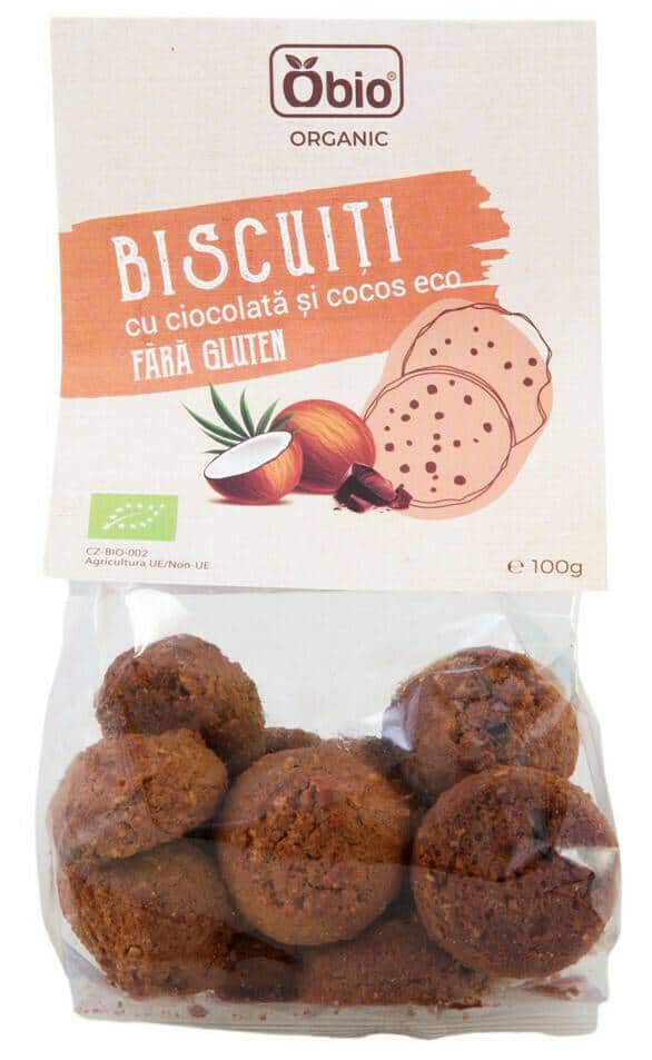 Biscuiti cu ciocolata si cocos, fara gluten, eco-bio, 100g – Obio Biscuiti bio fara gluten, deliciosi si satiosi. Ingrediente: faina de linte rosie 30%, grasimi vegetale nehidrogenate* (ulei de floarea soarelui*, unt de cacao*, apa, emulsifiant: lecitina