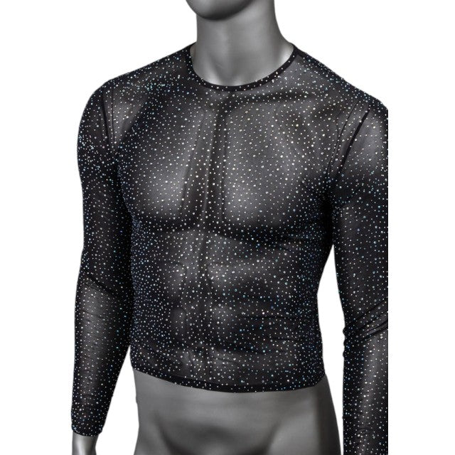 Bluză sexy bărbați CALEXOTICS Radiance Long Sleeve Shirt, design din plasă cu strasuri, negru, mărime universală CALEXOTICS Radiance Long Sleeve Shirt este alegerea perfectă pentru bărbații care doresc să adauge o notă de glamour seducător și rafinament senzual în ținutele lor de club, spectacole sau momente intime. Realizată dintr-un material elastic, moale și respirabil, bluza oferă un echilibru perfect între confort și atracție vizuală. Designul din plasă transparentă, decorat cu strasuri strălucitoare, reflectă lumina cu fiecare mișcare, punând în evidență corpul într-un mod subtil, dar irezistibil. Caracteristici cheie