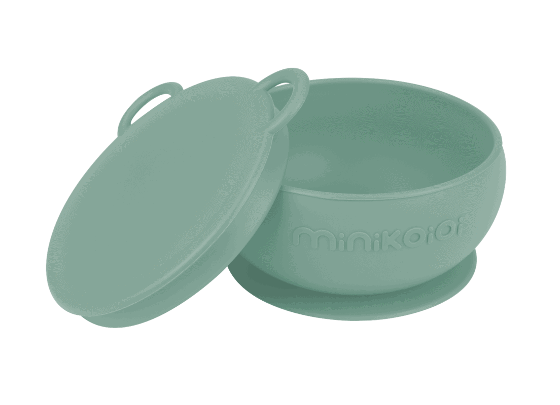 Recipiente pentru mancare, Bol cu ventuza si capac 100% Pemium Silicone River Green, 1 bucata, Minikoioi