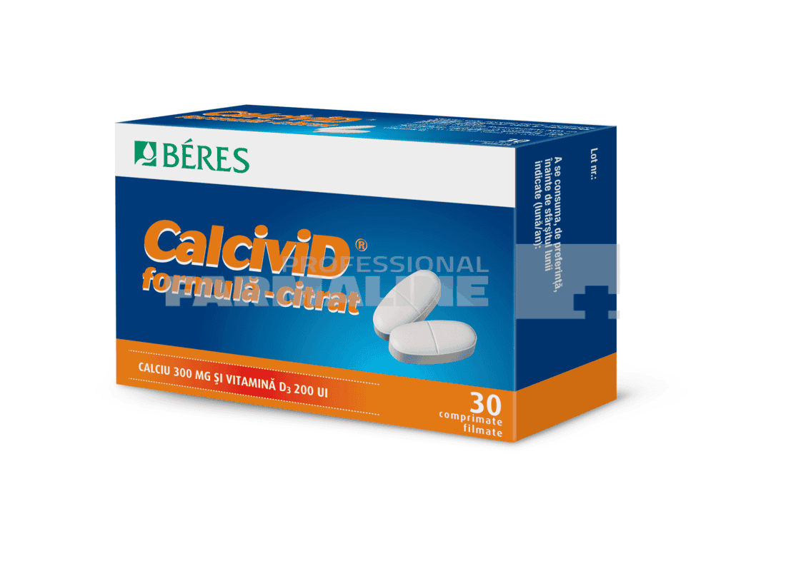 DescriereProprietăți- Absorbția bună neinfluențată de prezența alimentelor;- Biodisponibilitate crescută;- Potențial scăzut de iritare a mucoasei gastrice;- Nu favorizează depunerea calculilor renali;- Vitamina D3 favorizează absorbția calciului la nivelul intestinelor și ajută la depunerea lui la nivelul oaselor.Recomandări- Consum redus de produse lactate (regimuri hipocalcice);- Necesități crescute de calciu și vitamina D3 (perioada de creștere la copii, sarcină și alăptare, femei înainte și după menopauză);- În timpul curelor de slăbire (alimentație carențială);- Pacienților care prezintă contraindicații la alte forme de săruri de calciu sau nu răspund la tratamente cu alte formule de calciu;- Ca tratament adjuvant al osteoporozei.Avantaje CalciviD formulă-citratCalciviD Citrat este o sursă excelentă de suplimentare a calciului în organism. Caracteristica principală este solubilitatea înaltă la ph-uri scăzute, gustul neutru, conținutul suficient de calciu al tabletelor și biodisponibilitatea crescută.Nu necesită prezența crescută a HCL în stomac poate fi administrat pe stomacul gol.Prezintă siguranța din punct de vedere al sistemului renal chiar și la administrarea pe perioade îndelungate. Biodisponibilitate satisfăcătoare.Risc redus de iritare a mucoasei gastrice. CompozitieMod de administrarePentru adulți și copii peste 7 ani se recomandă 1-2 comprimat filmate pe zi. De preferință a se administra după mese. La nevoie, comprimatele filmate se pot diviza.ProducatorBeres PharmaceuticalsMod de prezentareCutie 30 comprimate
