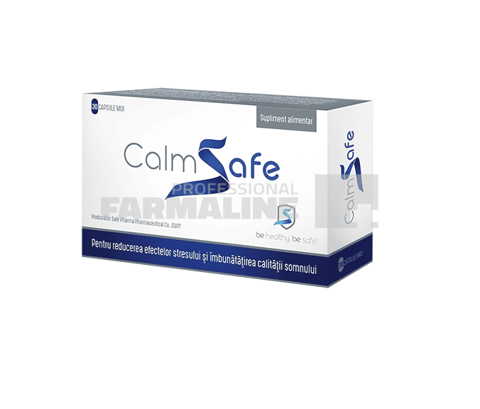 DescriereCalmSafe, supliment alimentar cu actiune simultana pe sistem nervos si muschi. Starea de relaxare musculara, calm psihic si somnul odihnitor de noapte sunt esentiale pentru sanatatea dvs, pentru performanta si productivitatea fizica si intelectuala. CalmSafe contine extract de Floarea –pasiunii, cu o concentratie ridicata de isovitexin, substanta din categoria flavonelor, cu actiune simultana pe sistem nervos si sistem muscular, de asemenea, aceasta substanta nu produce dependenta. CalmSafe ajuta persoanele cu solicitare intensa neuro-musculara, supuse stresului si eforturilor psihice si fizice constante.CalmSafe poate ajuta la:– Reducerea tensiunilor psihice, conferind o stare de liniste si calm interior;– Mentinerea unei bune relaxari a musculaturii;– Protejarea organismului impotriva stresuluiIngrediente/capsula: capsula: gelatina, anidrisorb, glicerol, apa purificata, dioxid de titan, etil hidroxibenzoat de sodiu, metilparaben, oxid rosu de fier; emulsifianti: ulei de soia, uleiuri hidrogenate de soia (tip II si I), lecitina de soia cu 45% fosfatide; extract hidroetanolic 4 :1 din parti aeriene de Floarea-pasiunii (Passiflora incarnata) cu 1,5% isovitexin – 230 mg*, agent de ingrosare: ceara galbena de albine; agent aromatizant: etilvanilina. (*doza zilnica nu a fost stabilita). Valoare nutritionala per capsula: valoare energetica 28,5 KJ (10 kcal); grasimi 0,527g; glucide 0,258g; proteine 0,220g; sodiu 0,000738g.Starea de calm psihic si somnul odihnitor de noapte sunt esentiale pentru sanatatea dumneavoastra, pentru claritatea gandirii, performanta si productivitatea intelectuala. CalmSafe contine extract de Floarea-pasiunii eficient in stari de agitatie si neliniste si care readuce calmul necesar, favorizand totodata instalarea usoara a somnului si promovand un somn de buna calitate pe toata durata noptii, fara a da dependenta.CalmSafe este un supliment care ajuta la:– reducerea tensiunilor psihice, conferind o stare de liniste si calm launtric,– armonizarea starii psiho-emotionale,– eliminarea tensiunilor psihice care impiedica instalarea somnului,– protejarea organismului impotriva stresuluiMod de administrareCate 1 capsula de 3 ori pe zi, de preferat in timpul meselor.ProducatorPharcoMod de prezentareCutie cu 30 capsule
