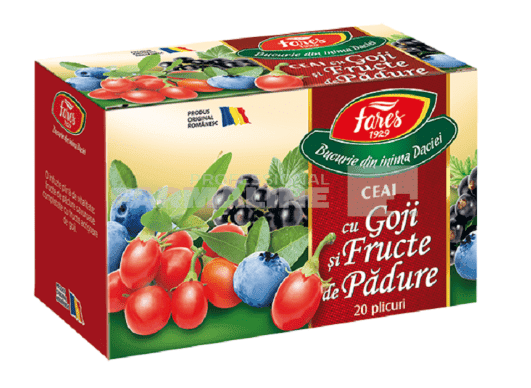 DescriereO infuzie plină de vitalitate: fructe de pădure savuroase, completate cu fructe acrișoare de goji.CompozitieFlori de hibiscus, amestec de fructe de pădure în proporţie variabilă min. 23% (măceșe, afine, coacăze), fructe de coriandru, mere, arome, fructe de goji 1%.Mod de administrarePeste un plic se toarnă 200 ml apă clocotită și se lasă 10 minute.ProducatorFaresMod de prezentareCutie cu 20 plicuri