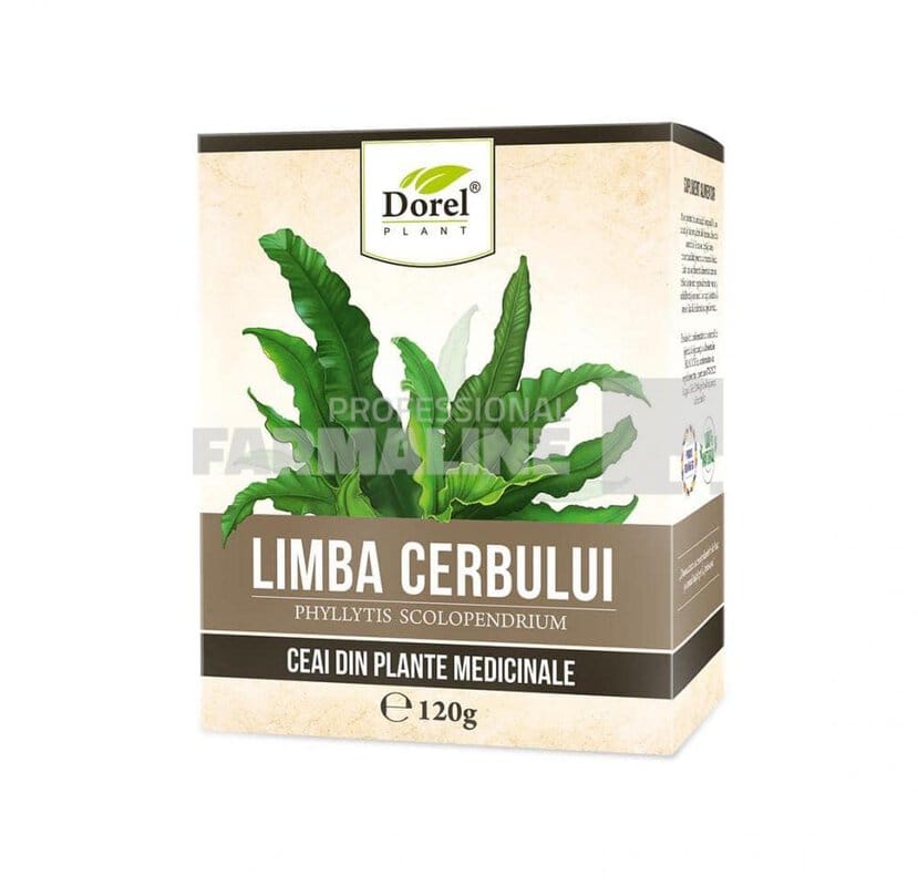 DescriereAcest produs are rol diuretic, astringent, diaforetic, cicatrizant, colagog. Contribuie la:- uz intern: utilizat in bolile pulmonare, degajeaza caile respiratorii, calmeaza tusea, in combaterea diareii, a febrei si in caz de diureza scazuta; favorizeaza evacuarea bilei in duoden, recomandat in obstructiile vezicii biliare;- uz extern: ajuta la vindecarea ranilor, trateaza parul gras si seboreea.CompozitieLimba cerbului (phyllytis scolopendrium) frunze, 100%.Mod de administrareSe face infuzie dintr-o lingura mare de amestec de plante la 500 ml apa, cand apa da in clocot, se pun plantele, se acopera, se opresc din fiert si se lasa la racit 15-20 de minute.Doza recomandata pentru consumul zilnic: se beau 2-3 pahare (a cate 150ml) de ceai pe zi.ProducatorDorel PlantMod de prezentareCutie 120 g