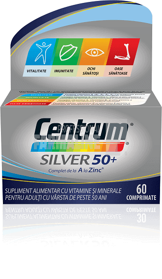 DescriereCentrum A-Zinc Silver 50 + este complet de la A la Zinc, iar acum este imbunatatit, pentru optimizarea beneficiilor zilnice asupra sanatatii. Este complet, avand o formula echilibrata, special creata pentru adulti cu varsta de peste 50 ani. Supliment alimentar cu vitamine, minerale si luteina. Contine gama completa de vitamine B, pentru mai multa energie. Fierul este necesar pentru transportul oxigenului in sange, iar cuprul sprijina utilizare fierului. Manganul, magneziul si fosforul indeplinesc roluri cheie in administrarea nivelurilor energetice din organismul dvs pe parcursul intregii zile, iar Iodul este necesar metabolismului energetic. Contine antioxidanti importanti pentru functionarea normala a sistemului imunitar. Contine Vitamina A si Luteina in cantitati echilibrate, pentru a ajuta la mentinerea unor ochi sanatosi. Contine ca si vitaminele D si K pentru a ajuta la sanatatea sistemului osos. Centrum combina Vitaminele A, C, biotina si nicotinamida, toate acestea contribuind la sanatatea pielii dvs. Mod de administrare 1 comprimat/zi, pentru adulti de peste 50 ani. Comprimatele au un invelis special, care le face usor de inghitit. Producator Wyeth Mod de prezentare Cutie cu 60 comprimate