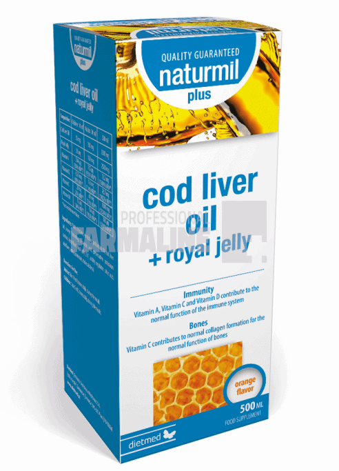 DescriereCompoziție unică ce asociază doi dintre cei mai importanți și recomandați meganutrienți: acizii grași Omega-3 din ulei din ficat de Cod și Lăptișor de matcă, având multiple beneficii asupra întregului organism. • asociere de acizi grași Omega-3, Lăptișor de matcă și Vitaminele A, B, C și D • compoziție unică cu rol antioxidant, antiinflamator, anti-aging, antitumoral, neurotropic • formulă ce poate fi utilizată de întreaga familie • gust natural de portocaleContribuie la: • menținerea sănătății sistemului cardiovascular și a creierului • menținerea sănătății ochilor, prevenind afecțiunile inflamatorii ale globului ocular • buna funcționare a sistemului imunitar și la refacerea mecanismelor de apărare ale organismului • susținerea organismului în perioadele de adaptare la schimbări de temperatură • ameliorarea proceselor inflamatorii • îmbunătățirea și menținerea elasticității articulațiilor • normalizarea nivelului de colesterol seric total • echilibrarea raportului LDL/HDL, prin creșterea nivelului de HDL și reducerea nivelului de LDL • menținerea sănătății și vascozității membranelor celulare • rederea fenomenului de oxidare și depunere a plăcii de aterom la interiorul vaselor de sânge • susținerea procesului de diviziune celulară normală • neutralizarea acțiunii radicalilor liberi • reducerea stresului oxidativ • dezvoltarea normală a fătului în cazul femeilor însărcinate, DHA fiind capabil să treacă prin placentă în sângele copilului • menținerea echilibrului emoțional • menținerea sănătății psihice • susținerea efortului fizic și intelectual • întârzie procesul de îmbătrânire • reducerea simptomelor specifice menopauzei • îmbunătățirea calității vieții femeilor de vârstă mai înaintată • reducerea concentrației de glucoză din sânge • refacerea țesuturilor și susținerea vindecării rănilorCompoziție/ 30 ml: Ulei din ficat de Cod 150 mg Lăptișor de matcă 150 mg Vitamina A 732 mcg (92% VNR*)Vitamina D3 9.6 mcg (192% VNR*)Vitamina C 60 mg (75% VNR*) Vitamina B2 1.6 mg (114% VNR*)*Valori de referință pentru nutriențiMod de administrare: Copii: câte 5 ml de 2 ori/zi, în timpul mesei, sau conform consultantului de specialitate.Adulți: câte 10 ml de 3 ori/zi, în timpul mesei, sau conform consultantului de specialitate.Contraindicații: Nu se recomandă administrarea în cazul persoanelor alergice la produse ale stupului sau la produse și derivate din pește.ProducatorDietmedMod de prezentareFlacon solutie orala 500 ml