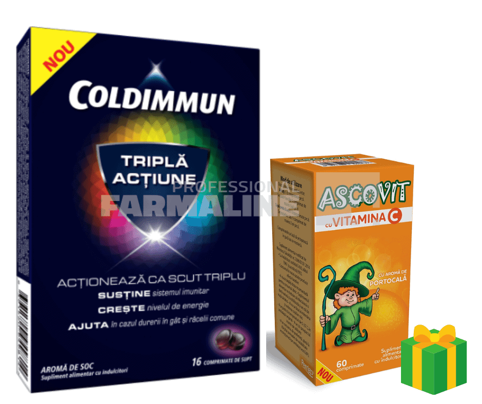 DescriereColdimmun aroma de socSupliment alimentar cu vitamine, minerale, extracte din plante și îndulcitori.Acționează ca scut triplu:1) Susține sistemul de apărare/imunitar al corpului (când sunteți răcit)2) Crește nivelul de energie3) Ajuta in cazul durerii în gât si racelii coumune prin ingredientele naturale: Socul contribuie la ameliorarea simptomelor gâtului iritat și a răgușelii, Echinacea sustine sanatatea tractului respirator, Mentolul Efect calmant asupra gatului, faringelui si corzilor vocale, Vitamina B2, vitamina C si niacina contribuie la reducerea oboselii și a extenuării, Vitamina C, zincul și seleniul contribuie la funcționarea normală a sistemului imunitar.Ascovit cu aroma de portocalaVitamina C (acidul ascorbic) este un important factor vitaminic cu rol in biogeneza substantei intracelulare, intervenind in procesele metabolice de oxidoreducere, in metabolismul glucidelor, proteinelor si lipidelor. Are un puternic efect antioxidant, participand la distrugerea radicalilor liberi si ajuta la functionarea normala a sistemului imunitar, crescand rezistenta organismului la infectii. In plus, Vitamina C favorizeaza depunerea calciului in oase, intervenind in formarea colagenului si creste rezistenta capilarelor, fiind un excelent tonic al capilarelor. Supliment alimentar util in carenta de vitamina C, care poate sa apara la copii sau adulti datorita unei alimentatii necorespunzatoare.CompozitieColdimmun aroma de socIndulcitori: izomalt, acesulfam de potasiu, aspartam; vitamina C /acid L-ascorbic;; t hidroetanolic 64:1(maltodextrina) din fructe de Soc(Sambucus nigra); premix vitamine(baza:maltodextrina; vitamina B3/niacina, vitamina D3/colecalciferol, acid folic 10%(maltodextrina), vitamina B6/ clorhidrat de piridoxina, vitamina B2/riboflavina, vitamina B1/ clorhidrat de tiamina, biotina); extract 45:1 din parti aeriene de Echinacea purpurea; premix de minerale (baza: maltodextrina; sulfat de zinc monihidrat, selenat de sodiu); potentatori de aroma: soc, coacaze negre(triacetina, propilenglicol); corector de aciditate: acid citric monohidrat; Enocianin (extract din seminte de struguri, guma acacia, dioxid de siliciu); mentol( din Menta arvensis ); extract etil-acetic (amidon modificat, maltodextrina, dioxid de siliciu)din radacina de Ghimbir (Zingiber officinale )Contine o sursa de fenilalanina. Contraindicat in caz de fenilcetonurie.Ascovit cu aroma de portocalaVitamina C (acid ascorbic) 100 mg, 166,66% DZRAroma (portocale, lamaie, grapefruit, piersici,capsuni, coacaze, zmeura) 3 mg.Excipienti pentru un comprimat.%DZR= procent din doza zilnica recomandataMod de administrareColdimmun aroma de socInstrucțiuni de utilizare: 2 comprimate pe zi, care se sug nu se inghit A nu se depăși doza recomandată pentru consumul zilnic. Comprimatele se ţin în cavitatea bucalǎ pânǎ la dizolvare; nu se mestecǎ şi nici nu se înghit întregi.Ascovit cu aroma de portocalaAdulti: 1 comprimat/ziCopii: se va administra la recomandarea medicului de familie sau a medicului cu specialitatea pediatrie.Comprimatele se lasa sa se topeasca lent in gura sau se mesteca.ProducatorOmega PharmaMod de prezentareCutie cu 16 comprimate + Cutie cu 60 comprimate