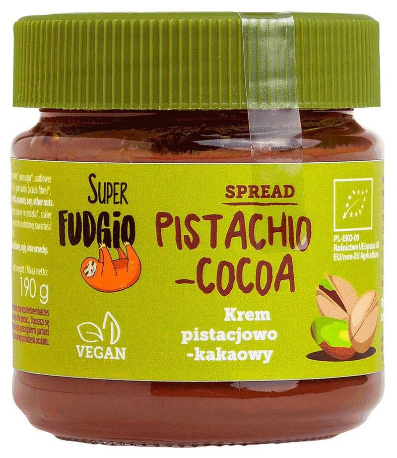 Crema tartinabila de ciocolata cu fistic si cacao, eco-bio, 190g – Super Fudgio