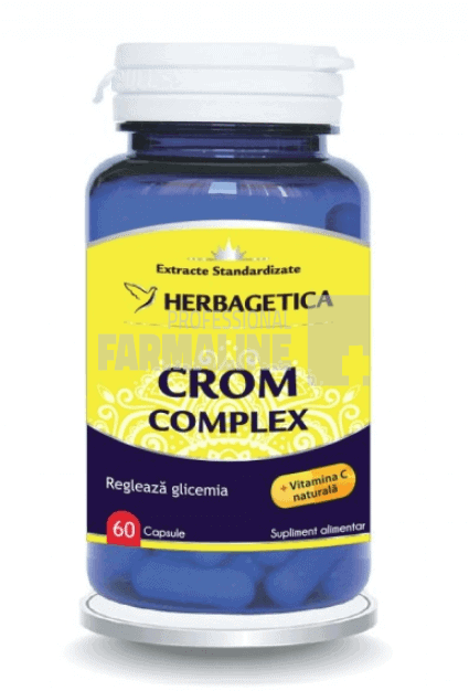 DescriereCrom Complex conţine doar minerale şi vitamine 100% naturale.Contribuie la:- reducerea hipertensiunii;- reducerea riscului de afecţiuni cardiace şi infarct;- stimularea metabolismului;- reducerea poftelor alimentare;- controlarea foamei;- protejarea ADN-ului;- controlarea rezistenţei la insulină;- prevenirea depresiei;- mărirea performanţei atletice.CompozitieDrojdie-de-bere(Saccharomyces cerevisiae) îmbogăţită cu 2000 mcg/g Crom (furnizând 40mcg Crom/100% VNR*) 20 mgAcerola (Malphigia glabra) extract standardizat cu 17% vitamina C (furnizând 12,75 mg vitamina C / 16% VNR*) 75 mgDrojdie-de-bere (Saccharomyces cerevisiae) pulbere uscată și inactivată  335 mgMod de administrareCâte 1 capsulă pe ziProducator HerbageticaMod de prezentareFlacon cu 60 capsule