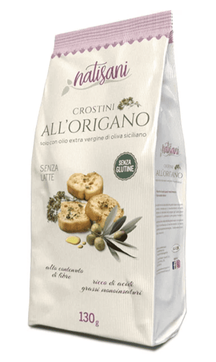 Crostini cu oregano, fara gluten, eco-bio, 130g – Natisani Crostini cu ulei extravirgin din masline siciliene. Ingrediente: apa, amidon de porumb, faina de orez, ulei extravirgin din masline siciliene 17%, fibre vegetale: inulina si psyllium, drojdie de