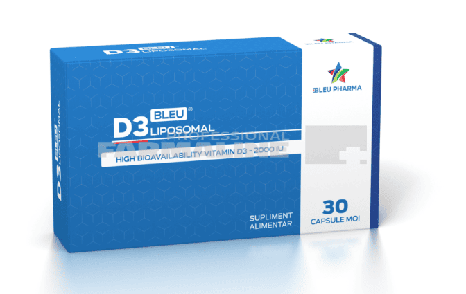 DescriereContine 2000 UI de vitamina D3 in varianta lipozomala cu eficienta sporita si ingrijire protectoare impotriva oxidarii.Susține sănătatea sistemului osos și a dinților.Ajută la absorbția și metabolismul normal al calciului și fosforului.CompozitieVitamina D3 lipozomală cu stabilitate de 100% și eficiență de 5 ori mai mare decât vitamina D3 normală.Mod de administrare1 capsulă/zi din septembrie până în aprilie.ProducatorBleu PharmaMod de prezentareCutie cu 30 capsule moi