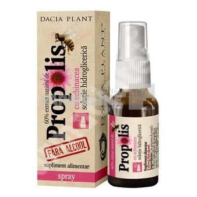 Descriere Propolis cu Echinacea fără alcool spray este un produs natural destinat menținerii sănătății cailor respiratorii, a cavitații bucale și a pielii. Dintre produsele naturale administrate pe cale orală, soluțiile fără alcool sunt cel mai ușor asimilate de către organism, extractul putând fi administrat inclusiv copiilor și adulților cu interdicție la alcool etilic. Proprietăți:Intern: – menținerea sănătății aparatului respirator; – susținerea imunității organismului.Extern: – dezinfectarea cailor respiratorii superioare; – dezinfectarea cavității bucale; – îndepărtarea mirosurilor neplăcute ale gurii; – împrospătarea respirației; – dezinfectarea pielii. CompozitieEchinacea (Echinacea purpurea) – extract hidrogliceric (68,67%); propolis – extract hidrogliceric cu minimum 12 mg/ml polifenoli (30%); amestec de uleiuri esentiale [menta-salbatica (Mentha arvensis)(28,58%); eucalipt (Eucalyptus globulus)(28,58%); bergamota (Citrus aurantium ssp. bergamia)(14,28%); lamaie (Citrus limonum) (14,28%); fenicul (Foeniculum vulgare)(14,28%)](1,33%).Mod de administrareIntern: Copii între 3 și 7 ani: câte un puf de 3 ori pe zi. Copii între 7 și 14: câte 1-2 pufuri de 3 ori pe zi. Adulți și tineri peste 14 ani: câte 2-4 pufuri de 3 ori pe zi. Produsul se administrează cu 30 minute înainte mesei. Pentru dezinfectarea căilor respiratorii superioare și a cavității bucale se administrează câte 2-4 pufuri în cavitatea bucală la nevoie.Extern: Pentru menținerea sănătății pielii se aplică 1-2 pufuri pe zona afectată la nevoie.ProducatorDacia PlantMod de prezentareFlacon 20 ml