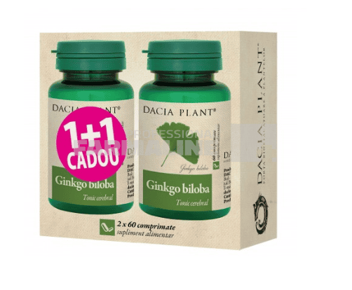 DescriereActiuni ale produsului naturist Ginkgo Biloba: tonic cerebral, stimulent al memoriei, reglator al circulatiei cerebrale si periferice, reglator psihoemotional, antidepresiv. Corecteaza bine tulburarile nervoase datorate stresului si batranetii. Acest remediu naturist este recomandat in: tulburari de memorie la orice varsta, astenie cerebrala, randament intelectual scazut, randament scolar scazut, sechele post accidente ischemice cerebrale, depresii, anxietate, atacuri de panica.Mod de administrareAdulti si tineri peste 15 ani: cate 1 comprimat de 2 ori pe zi, cu 30 de minute inaintea meseiProducatorDacia PlantMod de prezentareFlacon cu 60 comprimate + 60 comprimate