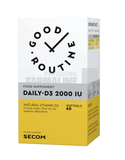 DescriereEste un nutrient esential, ce joaca un rol remarcabil in buna functionare a organismului prin influenta pe care o are asupra sistemului imunitar innascut si dobandit, sistemelor osos si muscular, sistemului nervos, sustinerii unui somn natural, sistemului cardiovascular. Daily-D3 2000IU reprezinta forma metabolic activa, bio-identica cu cea sintetizata de corpul uman la nivelul pielii.Un aport zilnic natural de Vitamina D3 pentru sustinerea imunitatii, a sistemelor osos, muscular si endocrin. Compusul activ este forma metabolic activa, bioidentica cu cea sintetizata de corpul uman la nivelul pielii, este extras dintr-o sursa naturala (lanolina) si este stabilizat in ulei de masline extra virgin, cu adaos de Vitamina E. Grasimile mononesaturate bogate in acizi grasi Omega-9 din uleiul de masline sustin sanatatea inimii si a vaselor de sange, in timp ce Vitamina E are rol de antioxidant ce oferă suport în reducerea proceselor de oxidare ale vitaminei D3.Daily-D3 2000 IU se prezinta sub forma de capsule gelatinoase, usor de administrat, concentratia de compus activ oferind sprijin pentru susținerea nivelului normal al Vitaminei D3 în sânge.CompozitieVitamina D3, Uleiul de masline extra virgin, Vitamina E.Mod de administrareAdulti si copii de peste 12 ani: 1 capsula/zi, la masa, cu 200ml apa sau conform recomandarii consultantului de specialitate.ProducatorSecomMod de prezentareFlacon 60 capsule moi
