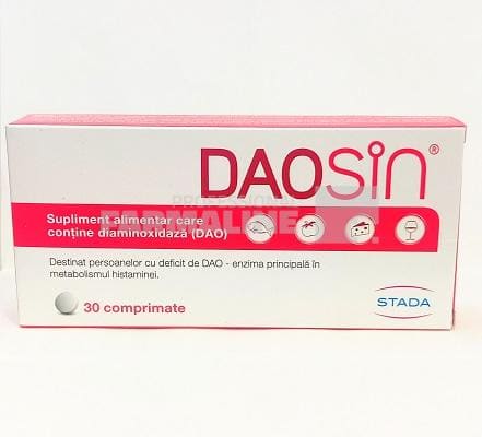 Daosin este un supliment alimentar, unic în România, care conţine DiAmiOxidază (DAO) de origine naturală.Te ajută să tolerezi alimente care în mod normal îți produc disconfort şi în acest mod să ai o dietă variată și echilibrată.Previne simptomele neplăcute cauzate de histamina în exces.După consumul anumitor alimente, unii dintre noi experimentează stări și senzații neplăcute, care afectează ritmul obișnuit al vieții provocând stări de iritabilitate generală. De cele mai multe ori, aceste simptome sunt asociate cu diverse afecțiuni digestive, alergii alimentare sau intoleranțe alimentare.O intoleranță alimentară înseamnă incapacitatea organismului de a digera corect un aliment și se manifestă printr-o varietate de semne și simptome:Urticarie (erupții pe piele care provoacă mâncărimi) sau doar mâncărimi foarte pronunțate ale pielii;Tulburări digestive (greață, vărsături, dureri gastrice, balonare, gaze, constipație cronică sau diaree);Dureri de cap, migrenă, dureri musculare;Rinoree (secreţii nazale apoase), mâncărimi nazale, senzația de nas înfundat;Lăcrimarea ochilor, ochi înroșiți, strănut, dificultăți în respirație;Tulburări de ritm cardiac (bătăi neregulate ale inimii, puls cardiac crescut);Oboseală cronică;Anxietate inexplicabilă;Ciclu menstrual neregulat, însoțit sau nu de durere menstruală severă.Dacă te confrunți cu astfel de reacții în mod frecvent, este posibil să ai intoleranță la histamină.Dar ce este histamina și ce înseamnă intoleranța la aceasta?Histamina este un mediator chimic ce aparţine grupului aşa-numitelor amine biogene. Fiind o substanţă cu rol de mediator chimic, histamina are diferite funcţii în organism. În principal, histamina acţionează ca un mediator al proceselor inflamatorii în reacţiile alergice. Ca neurotransmiţător, intervine, printre altele, în reglarea ritmului somn-veghe şi în controlul apetitului, precum şi în capacitatea de învăţare şi memorare.Histamina este produsă de celulele organismului uman, dar poate proveni şi din afara organismului, respectiv din alimentele pe care le consumăm.Intoleranţa la histamină este consecinţa unui dezechilibru între histamina acumulată în organism şi capacitatea de degradare a acesteia. DiAminOxidaza (DAO) este cea mai importantă enzimă de degradare a histaminei. Dacă activitatea DiAminOxidazei (DAO) este scăzută, histamina se va acumula în sânge și va determina apariția simptomelor specifice intoleranţei la histamină.Când dieta este bogată în alimente ce conţin histamină, activitatea DAO poate fi insuficientă, ceea ce duce la o descompunere întârziată a histaminei la nivelul intestinului. În plus, alcoolul şi anumite medicamente pot reduce semnificativ activitatea enzimatică a DAO.CompozitiePutem controla simptomele asociate intoleranței la histamină?Simptomele pot fi ameliorate printr-o dietă strictă cu evitarea alimentelor bogate în histamină, prin administrarea de antihistaminice sau prin suplimentarea de DiAminOxidază (DAO).Dieta strictă presupune reducerea varietății din alimentație, care la rândul său poate provoca anumite carențe în organismul nostru. „Alimentația sănătoasă” este pe buzele tuturor, însă ce presupune ea, mai exact? O alimentație sănătoasă trebuie înțeleasă în termeni de varietate și moderație. Dieta corectă este aceea care implică o varietate de alimente – carne, legume, fructe, cereale. Cu alte cuvinte, nu putem mânca cinci zile la rând doar salată și considera că am mâncat sănătos. Cheia este varietatea.Antihistaminicele sunt o clasă de medicamente utilizate adesea pentru inhibarea secreției de histamină, fără să suplimenteze deficitul de DiAminOxidază. Tratează simptomele alergice cauzate de excesul de histamină, dar nu rezolvă cauza intoleranței la histamină și nu pot fi utilizate preventiv.Suplimentarea de DiAminOxidază (DAO) poate fi o soluție eficientă pentru prevenirea simptomelor intoleranței la histamină.Simptome provocate de intoleranța la histamină:Tulburări digestive (sindrom de colon iritabil, dureri gastrice, flatulență, diaree)Rinoree (secreţii nazale apoase)Erupții cutanate (înroșirea și mâncărimea pielii)Tulburări de ritm (bătăi neregulate ale inimii, puls cardiac crescut)Dureri musculare, dureri de cap, migrenăOboseală cronicăSimptomele pot fi ameliorate prin:Dietă strictă cu evitarea alimentelor bogate în histaminăAntihistaminiceSuplimentare de DiAminOxidază (DAO)Cauzele intoleranței la histamină:Intoleranța la histamină se manifestă clinic în momentul în care în organism se găsește o cantitate de histamină, pe care acesta nu o poate degrada.DiAminOxidaza (DAO) este cea mai importantă enzimă de degradare a histaminei. Dacă activitatea DiAminOxidazei (DAO) este scăzută, histamina se va acumula în sânge.Deficitul de DiAminOxidază (DAO) poate fi primar (determinat genetic) sau secundar anumitor boli (boli inflamatorii intestinale).Când dieta este bogată în alimente ce conţin histamină, activitatea DAO poate fi insuficientă, ceea ce duce la o descompunere întârziată a histaminei la nivelul intestinului. În plus, alcoolul si anumite medicamente pot reduce semnificativ activitatea DAO.Alimente cu conținut ridicat de histamină care cauzează simptomele:Brânza maturată;Alimente fermentate, murături (varză murată, castraveţi muraţi);Albuş de ou;Mezeluri afumate (salam, cârnați, șuncă afumată);Alcool (vin roșu și șampanie);Cacao (inclusiv ciocolata);Leguminoase (năut, soia,linte, fasole), nuci, dulciuri sau snacks-uri cu aditivi și coloranți;Oțet;Fructe de mare, pește;Legume (roșii, spanac, vinete, avocado);Fructe (căpșune, ananas, banane, citrice, zmeură).Brânza maturată;Medicamente care eliberează histamina sau inhibă DAO:Miorelaxante: pancuroniu, alcuroniu, D-tubocurarina;Narcotice: tiopen