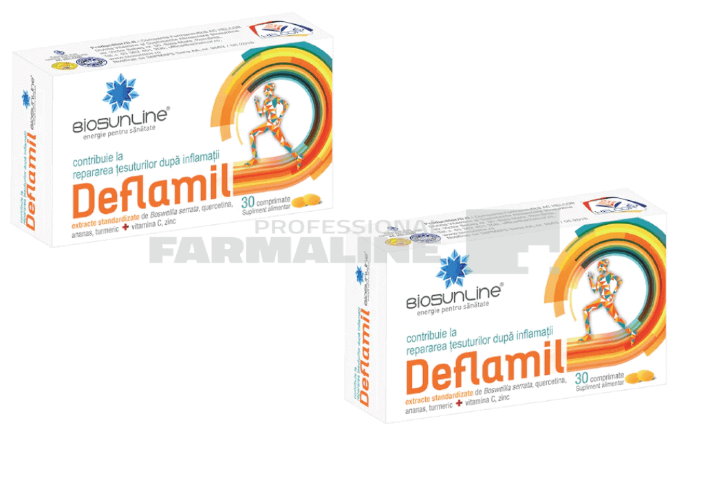 DescrierePrin compozitia sa complexa de origine vegetala, Deflamil:- sustine sanatatea cartilajelor, ligamentelor şi a articulatiilor osoase inflamate.- reduce stresul oxidativ, sustine mobilitatea si flexibilitatea articulatiilor,- contribuie la repararea tesuturilor dupa inflamatii, post-operator si post-traumatic.- prin aportul de Vitamina C, contribuie la formarea normala a colagenului pentru functionarea normala a ligamentelor si a sistemului osos.- reduce tulburarile functionale de la nivelul articulatiilor, precum si a senzatiei de articulatii rigide.CompozitiePer 3 comprimate: extract din rasina de Boswellia serrata, standardizat la min. 65% acid boswellic – 300 mg, extract din fructe de Ananas (Ananas comosus) 300 mg, extract din muguri florali de Salcâm-japonez (Sophora japonica), standardizat la 98% quercetina 210 mg, extract din scoarta de Pin (Pinus massoniana) standardizat la min. 95% proantocianidine 210 mg, extract din rizomi de Turmeric (Curcuma longa) standardizat la 70% curcumine 150 mg, Vitamina C 30 mg, Zinc 15 mg si excipienti.Mod de administrare3 (trei) comprimate pe zi, cu o cantitate suficienta de lichid, sau conform recomandarii personalului de specialitate.ProducatorHelcorMod de prezentareCutie cu 30 comprimate + Cutie cu 30 comprimate