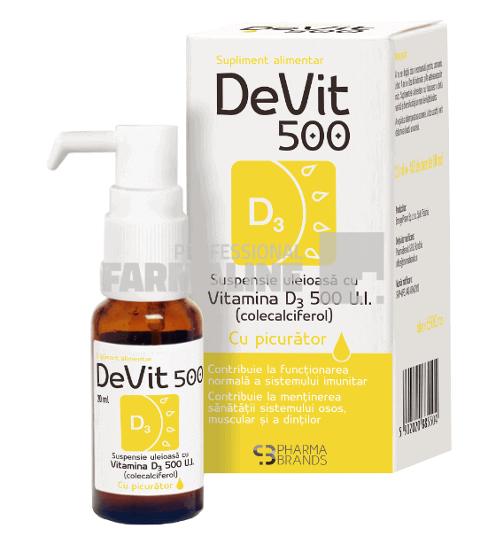DescriereFiecare picătură DeVit livrează 500 U.I. (12,5 μg) vitamina D3.Flaconul este prevăzut cu picurător, ceea ce permite dozarea precisă. Utilizarea este facilă, fiind o alternativă convenabilă la tablete și capsule.DeVit 500 poate fi administrat din prima zi de viață! Flaconul se manevrează ușor datorită picăturilor adaptate administrării copiilor (fiecare picătură elibereză 500 U.I. vitamina D3).Picăturile se pot pune direct în gură sau amestecate în lapte sau alimente.DeVit 500 nu conține: zahăr, îndulcitori, coloranți, lactoză, gluten, cazeină, arome.Conținut 1 picătură (50 mcl)%VNR*Vitamina D3 12,5μg = 500 U.I.250%*Valoarea Nutrițională de Referință calculată cf. Regulament 1169/2011Absorbție rapidă prin mucoasa bucală!Fiecare picătură DeVit 500 asigură vitamina D3 în cavitatea bucală.Penetrează țesutul moale al obrazului interior, transportând substanțele nutritive în sistemul bogat vascularizat al cavității bucale.CompozitieVitamina D3/colecalciferol (bază: MCT/trigliceride cu catenă medie din ulei de Palmier/Elaeis guineensis) – 100%.Mod de administrarepicături / ziNou-născuți și sugari 1 – 2 500 – 1000 U.I.Copii 3-6 ani 2 – 3 1000 – 1500 U.I.Copii 6-12 ani 2 – 3 1000 – 1500 U.I.Copii de peste 12 ani și adulți 3 – 4 1500 – 2000 U.I.ProducatorPharma BrandsMod de prezentareFlacon 20 ml
