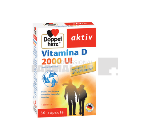 DescriereCercetări recente au arătat că Vitamina D are funcții multiple pentru sănătate. Cu toate acestea însă, în cazul multor persoane, asimilarea din alimentație nu este suficientă.Societatea Germană pentru Nutriție (DGE) a mărit în mod considerabil valorile recomandate pentru aportul necesar în cazul absenței unei producții proprii de Vitamina D de către organism. Din acest motiv, capsulele Doppelherz® conțin 50 µg Vitamina D. Aceasta corespunde unei cantități de 2000 UI (unități internaționale) de Vitamina D. Este bine cunoscut faptul că Vitamina D contribuie la menținerea concentrațiilor normale de Calciu în sânge, iar Calciul este necesar pentru menținerea sănătății sistemului osos. Deoarece vitamina ajută și la încorporarea calciului atât în oase, cât și în structura dinților, poartă și denumirea de „ajutor de fixare”. Fără suficientă Vitamină D în organism, doar aproximativ 10-15% din cantitatea de calciu și 60% din cea de fosfor ar fi absorbite, care au o importanță vitală pentru sănătatea oaselor.Astăzi știm însă, că Vitamina D îndeplinește, dincolo de aceasta, numeroase alte funcții importante în organism.Vitamina D contribuie la:• absorbția/utilizarea normală a calciului;• menținerea sănătății sistemului osos și a dinților;• menținerea funcției normale a sistemului muscular;• funcționarea normală a sistemului imunitar și participă la procesul de diviziune celulară.CompozitieVitamina D 50 µgMod de administrareSe recomandă 1 capsulă zilnic, nemestecată, în timpul mesei sau imediat după aceasta, cu o cantitate suficientă de lichid. Administrarea unei cantități mai mari de Vitamina D față de cea conținută într-o capsulă (50 µg), se va face numai la recomandarea medicului.ProducatorDoppelherzMod de prezentareCutie 30 capsule