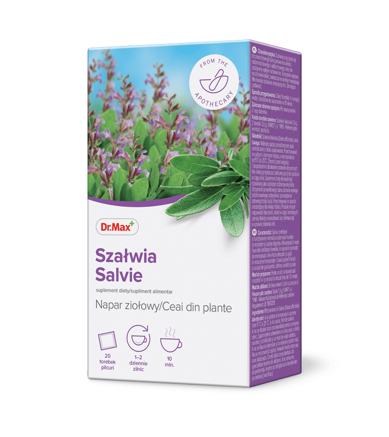 Dr. Max Ceai Salvie este un supliment alimentar sub forma de ceai, ambalat in plicuri individuale, care contribuie la functionarea normala a sistemului imunitar si respirator si sustine digestia.