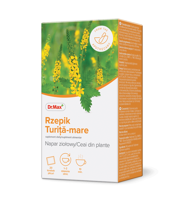 Dr. Max Ceai Turita-mare este un supliment alimentar sub forma de ceai, ambalat in plicuri individuale, care sustine functionarea normala a ficatului.