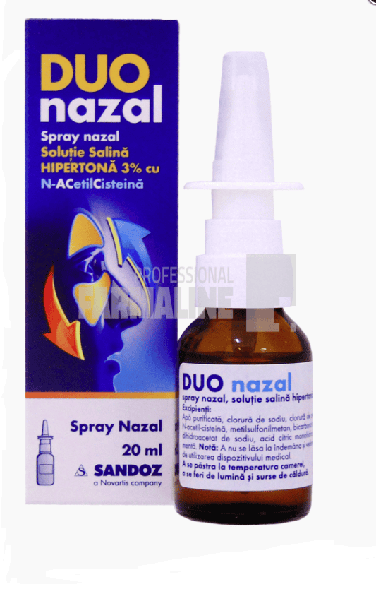 DescriereDuo nazal este o solutie salina hipertona cu pH controlat,pentru igiena nazala zilnica.Acest dispozitiv medical este inclus in categoria solutiilor saline de irigare nazala,folosite pentru irigarea si curatarea cavitatilor nazale si sinusale.Acesta are urmatoarele roluri: – curata si hidrateaza mucoasa nazala;- reduce uscaciunea si iritatia mucoasei nazale,cauzate de factori externi,de exemplu poluarea din mediul inconjurator;- regleaza secretiile nazale dupa episoadele de rinita si previne formarea biofilmelor bacteriene;Poate fi utilizat ca adjuvant la pacientii cu afectiuni ale sinusurilor,in asociere cu tratamentul recomandat de medic.CompozitieApa purificata,clorura de sodiu,clorura de potasiu,clorua de magneziu,clorura de calciu,N-acetilcisteina,metilsulfonilmetan,bicarbonat de sodiu,ascorbil fosfat de sodiu,EDTA disodic,dihidroacetat de sodiu,acid citric monohidrat,citrat de potasiu,alcool benzilic,aroma de menta.Mod de administrare2-3 pufuri in fiecare nara, de 3-4 ori pe zi sau mai frecvent, daca este necesar.ProducatorSandozMod de prezentareFlacon 20 ml