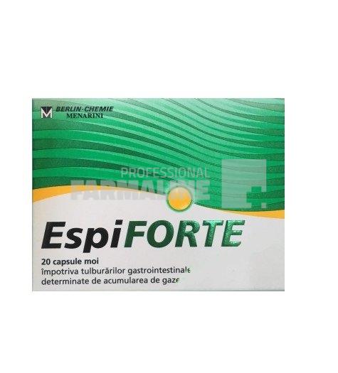 DescriereEspi Forte este utilizat in:-tratamentul simptomatic al tulburarilor gastrointestinale determinate de acumularea de gaze;de exemplu,balonare(meteorism) sau flatulenta,senzatie de plenitudine;-pregatirea in vederea examinarilor cu scop diagnostic;de exemplu,radiografie,ecografie si endoscopie.Substanta activa,simeticona,dezintegreaza spuma din tractul gastrointestinal in mod pur fizic si este inactiva din punct de vedere biologic si chimic.Prin urmare,intoxicarea ca rezultat al supradozajului este practic exclusa.Compozitie140mg simeticona;gelatina,glicerol 85%,galben de chinolina(E 104),oxid rosu de fer(E 172).Mod de administrareDoza unica 1 capsula echivalent a 140mg simeticona.Doza zilnica 3-5 capsule(echivalent a 420-700mg simeticona).ProducatorBerlin ChemieMod de prezentareCutie cu 20 capsule moi