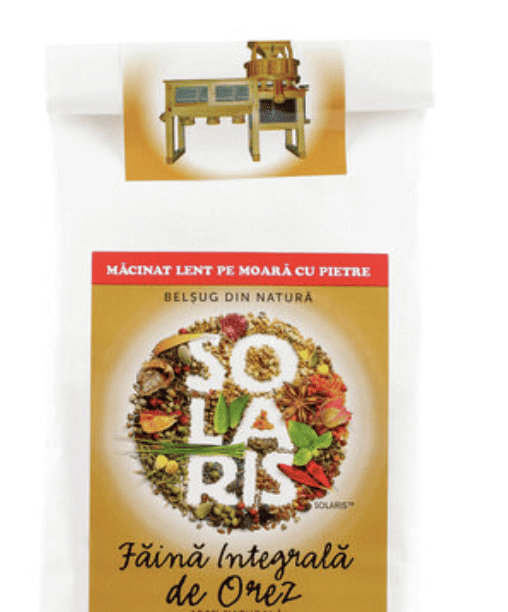 Faina integrala de orez, 650g – Solaris Făina Integrală de Orez este o sursă bogată de carbohidrați complecși, fibre, vitamine B, mangan, fosfor, magneziu, zinc și antioxidanți. Este obținută prin măcinarea lentă a boabelor de orez brun în moara tradițio