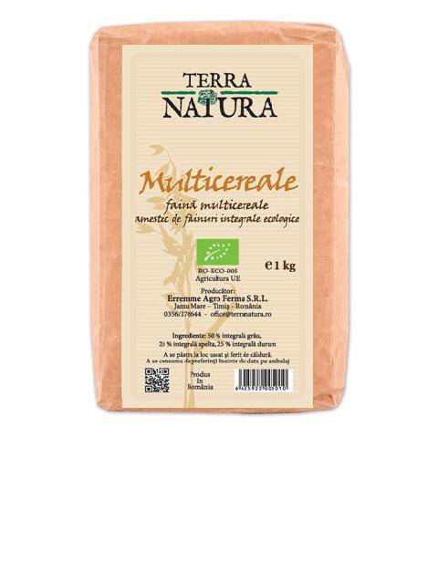 FAINA INTEGRALA MULTICEREALE ECO-BIO 1KG – TERRA NATURA Faina este obtinuta numai din propriile cerealele ecologice cultivate la ferma din Jamu Mare. Moara este mica, avand o productivitate redusa, asta reprezentand un avantaj, deoarece faina produsa est