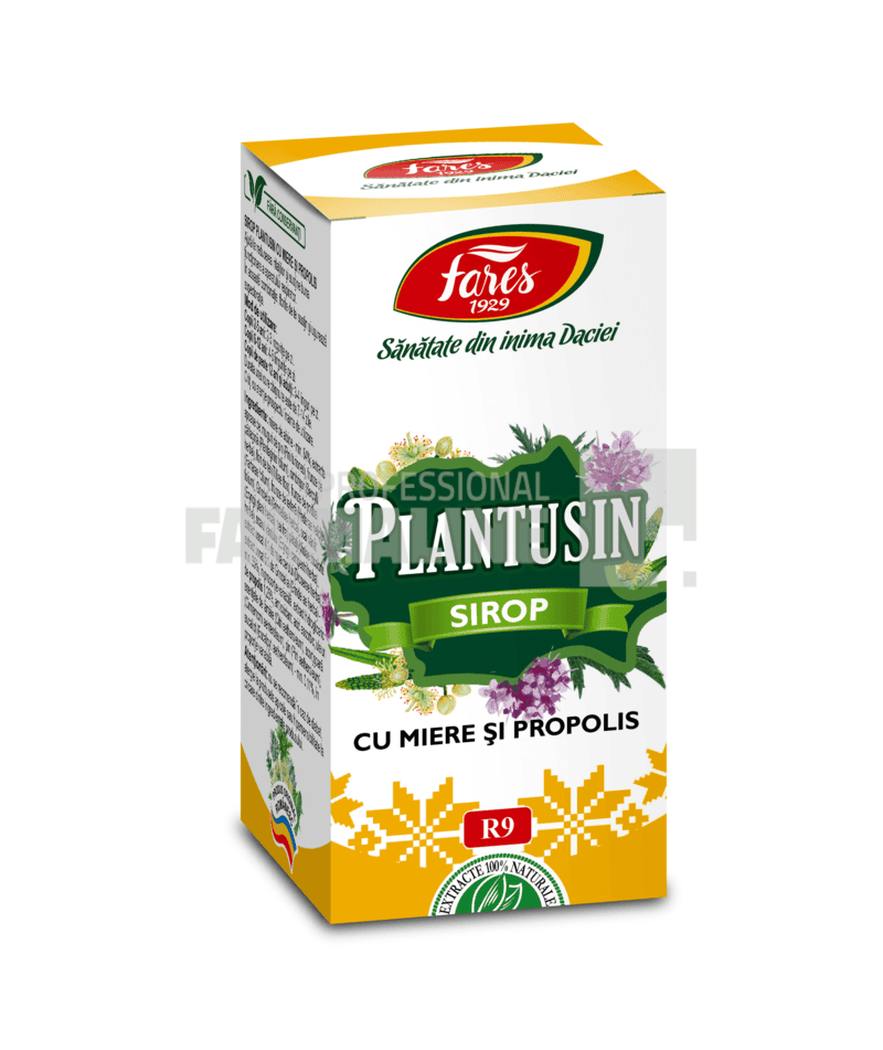 DescriereSiropul Plantusin cu miere și propolis -R9 protejează mucoasa traheobronșică și susține buna funcționare a aparatului respirator.BENEFICII• de peste 25 de ani recomandat în tusea iritativă, spastică sau productivă, de diferite etiologii (răceală, gripă, laringită, faringo-traheită, bronșită);• susținut de recomandările frecvente ale medicilor de familie și medicilor pneumologi;• emolient, expectorant, spasmolitic, antiinflamator, antiseptic respirator;• eficiență confirmată clinic;• poate fi administrat în sarcină și alăptare;• nu conține conservanți, îndulcitori artificiali, coloranți și arome sintetice.Compozitie- Miere de albine – min. 64%; extracte apoase de: muguri de pin (Pini turiones), frunze de pătlagină (Plantaginis folium), cimbrişor (Serpylli herba), flori de tei (Tilliae flos), frunze de podbal (Farfarae folium), frunze de iederă (Hederae helicis folium), Grindelia (Grindeliae herba), scai vânăt (Eryngii plani herba), trei fraţi pătaţi (Violae tricoloris herba), scaiul vântului (Eryngii campestri herba), extract uscat 4:1 de roua cerului (Droserae herba), extract uscat 5:1 de Grindelia (Grindeliae herba) – min. 35%, în proporţie variabilă; extract hidrogliceric de propoli 1,25%- Antioxidant: acid ascorbic- Uleiuri esenţiale de lămâie (Citri aetheroleum), scorţişoară (Cinnamomi aehteroleum), pin (Pini aetheroleum), eucalipt (Eucalpyti aetheroleum) – min. 0,11%, în proporţie variabilăMod de administrareCopii 2-5 ani: 2-3 linguriţe pe zi.Copii 6-12 ani: 4-5 linguriţe pe zi.Copii de peste 12 ani şi adulţi: 3-4 linguri pe zi.Durata curei: 7-14 zileProducatorFaresMod de prezentareFlacon 100 ml