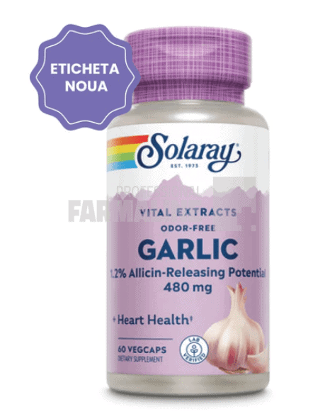 DescriereExtract standardizat din bulbi de Usturoi pentru imbunatatirea sanatatii cardiovasculare, gastrointestinale, respiratorii si imunitare.Contribuie la:- sustinerea activitatii normale a sistemului cardiovascular:- scaderea sintezei LDL-colesterolului si a colesterolului total la nivel hepatic;- protejarea arterelor prin reducerea rigidizarii vasculare si favorizarea stabilizarii placii de colesterol;- reducerea riscului de formare a trombilor intravasculari;- mentinerea valorilor normale ale presiunii arteriale;- imbunatatirea sanatatii hepatice;- activarea enzimelor implicate in detoxifierea hepatica;- protectia ficatului impotriva acumularii de grasimi – efect lipotropic;- fluidificarea si eliminarea secretiilor bronsice;- imbunatatirea raspunsului imunitar si a diviziunii celulare;- protejarea celulelor impotriva stresului oxidativ indus de radicalii liberi de oxigen si azot.CompozitieUsturoi 500 mg (Allium sativum)(extract standardizat din bulbi, garantat 6mg [1.2%] alicina-potential de eliberare).Mod de administrareCate 1 capsula/zi la masa cu 200ml de apa sau conform recomandarii consultantului de specialitate. ProducatorSecomMod de prezentareFlacon 60 capsule