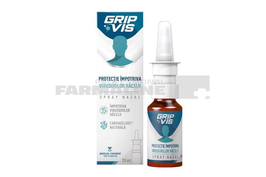 DescriereGripVis poate fi utilizat pentru prevenţia şi tratamentul de susţinere al bolilor virale asemănătoare gripei.Formează un film protector hidratant care asigură o hidratare de durată a mucoasei nazale și, prin urmare, sprijină apărarea naturală a organismului. GripVis Spray nazal poate fi utilizat pentru hidratarea mucoasei nazale şi astfel, pentru prevenirea şi tratamentul de susţinere al tuturor simptomelor generate de o mucoasă nazală uscată şi iritată.După administrare, GripVis Spray nazal formează o barieră protectoare asupra mucoasei nazale. Poate fi folosit profilactic în timpul sezonului rece sau în situațiile în care există un risc crescut de infecție virală transmisă prin aer (călătorie, utilizarea transportului public, spații publice interioare aglomerate etc.)Ca tratament al simptomelor de răceală incipiente (de exemplu, dureri în gât, furnicături în nas, curgerea nasului), administrarea ar trebui să înceapă cât mai devreme și trebuie continuată până când simptomele s-au diminuat.Pulverizați un puf de cel puțin 3 ori pe zi în fiecare nară.În cazul în care apare febra sau dacă după o săptămână de tratament simptomele nu se ameliorează, trebuie să vă adresaţi medicului. Pentru a hidrata mucoasa nazală uscată, pulverizaţi câteva pufuri în nas de mai multe ori pe zi, după cum este necesar.CompozitieGripVis Spray nazal este o soluţie limpede, incoloră, vâscoasă, fără miros. 1 ml soluţie conţine iota-caragenan 1,2 mg (Carragelose®), kappa-caragenan 0,4 mg, clorură de sodiu şi apă purificată.Mod de administrareDupă administrare, GripVis Spray nazal formează o barieră protectoare asupra mucoasei nazale. Poate fi folosit profilactic în timpul sezonului rece sau în situațiile în care există un risc crescut de infecție virală transmisă prin aer (călătorie, utilizarea transportului public, spații publice interioare aglomerate etc.)Ca tratament al simptomelor de răceală incipiente (de exemplu, dureri în gât, furnicături în nas, curgerea nasului), administrarea ar trebui să înceapă cât mai devreme și trebuie continuată până când simptomele s-au diminuat.Pulverizați un puf de cel puțin 3 ori pe zi în fiecare nară.În cazul în care apare febra sau dacă după o săptămână de tratament simptomele nu se ameliorează, trebuie să vă adresaţi medicului.Pentru a hidrata mucoasa nazală uscată, pulverizaţi câteva pufuri în nas de mai multe ori pe zi, după cum este necesar.ProducatorBerlin ChemieMod de prezentareFlacon 20 ml