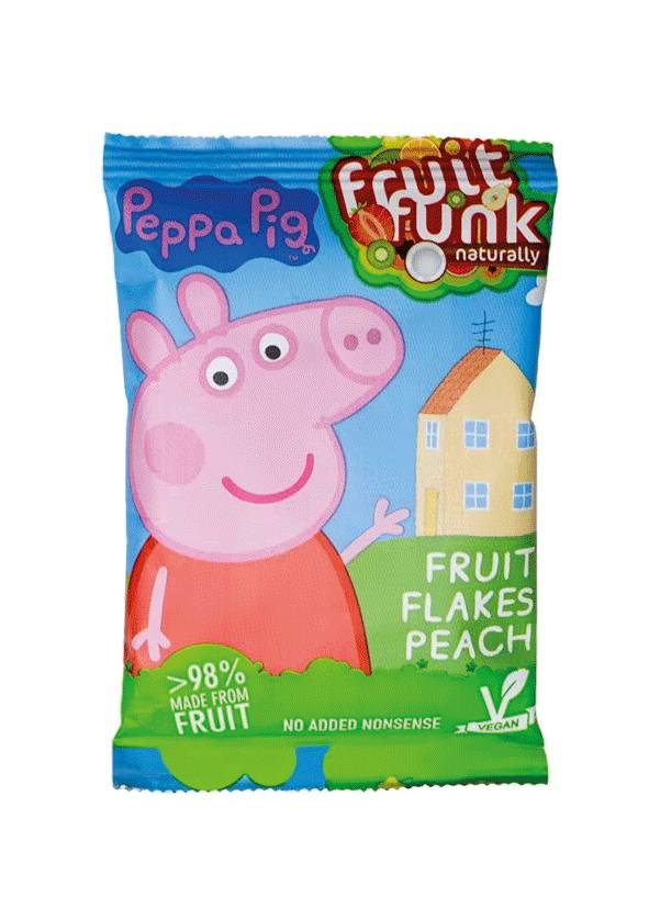 Gustare-jeleuri din fructe cu piersici – Peppa pig, vegan, fara zahar 16g Fruit Funk Gustare ideala pentru cei mici. Jeleuri din fructe, fara zahar, gelatina sau coloranti, doar din ingredient naturale. >98% fructe fara zahar adaugat fara lactoza vega
