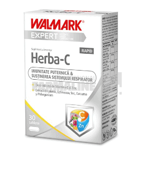 DescriereHerba-C RAPID este un produs de calitate superioară care conţine doze mari de Vitamina C și Zinc pentru susținerea sistemului imunitar, dar şi o combinaţie optimă de 4 extracte din plante utilizate în mod tradiţional pentru susţinerea sistemului respirator.Doză ridicată de Vitamina C şi Zinc:- combinaţie optimă şi echilibrată de extracte din plante: Echinacea, Soc, Pelargonium şi Curcuma ;- toate ingredientele au acţiune dovedită clinic în susţinerea imunităţii şi a tractului respirator;- susţinere puternică a sistemului imunitar şi respirator;- recomandat în special în perioadele de nevoie acută, cum ar fi în caz de răceală şi gripă.Echinacea, Curcuma, Socul, Vitamina C şi Zincul contribuie la întărirea imunității organismului.Echinacea, Pelargonium, Curcuma şi Socul contribuie la susţinerea sănătăţii sistemului respirator.Curcuma, Socul, Vitamina C şi Zincul acționează ca antioxidanți și protejează celulele de stresul oxidativ cauzat de radicalii liberi.CompozitieAcid L-ascorbic, agenți antiaglomeranți: celuloză, stearat de magneziu, talc, dioxid de siliciu, acid stearic; extract Sambucus nigra, extract Pelargonium sidoides, stabilizatori: carboximetil celuloză sodică încrucișată, hidroxipropil metilceluloză, polidextroză; extract Echinacea purpurea, extract Curcuma longa, citrat de zinc, coloranţi: dioxid de titan, albastru briliant, riboflavină; trigliceride cu catenă medie, maltodextrină.Mod de administrareCa supliment alimentar, 1 tabletă pe zi, după masă. În caz de nevoie acută, 2 tablete pe zi. ProducatorWalmarkMod de prezentareCutie cu 30 tablete