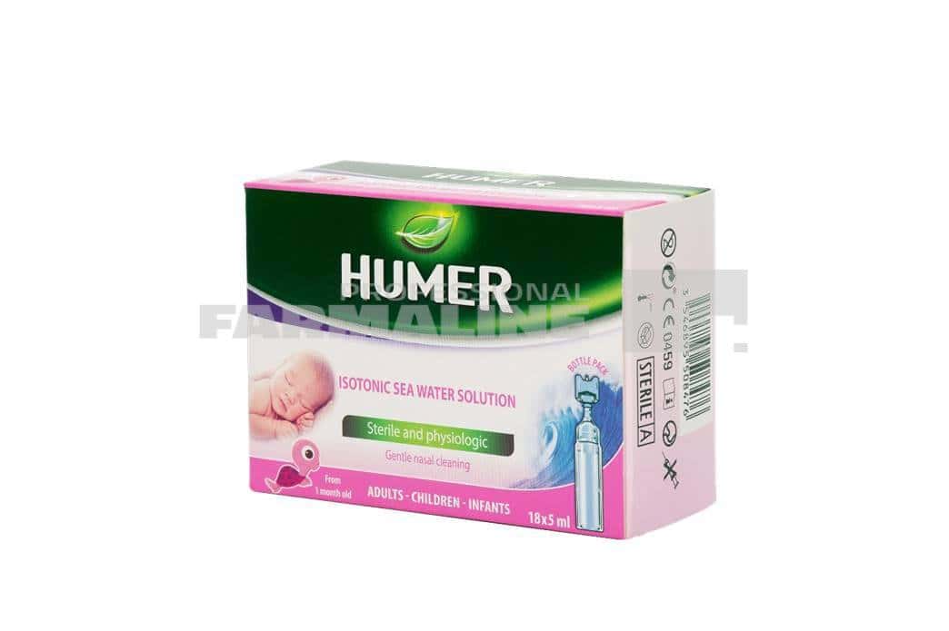 DescriereHUMER MONODOZE este un dispozitiv medical indicat pentru igiena regulată a nasului. El permite curățarea si umezirea mucoasei nazale în caz de congestie, obstrucție sau rinoree.Proprietăți: Mucozitățile nazale pot fi abundente, uscate sau groase în caz de inflamare a sistemului respirator superior (iritațoo, alergii, infecții). O obstrucție nazală (polip, tumoare benigna, etc) și o suflare repetată a nasului pot deteriora mucoasa și favoriza iritațiile, infecțiile și durerile la nivelul sinusurilor. Aplicarea regulată sau ocazională de Humer Monodoze umezește mucoasa nazală fără a o irita. Acest lucru facilitează eliminarea mucusului și previne iritația și uscarea mucoasei. Avantaje: Potrivit pentru sugari, începând de la 1 luna, recipient fără presiune.Formulă blândă pentru nou-născuti: compoziţie naturală fără antiseptic şi conservanţi.Bogat in mod natural in săruri minerale si oligoelementeConținut sterilCompozitieApă de mare – Apă purificată Mod de administrarePentru bebeluşi, poate fi utilizat până la 6 ori pe zi.Instrucțiuni de utilizare:Detașați un flacon de Humer Monodoze și deschideți flaconul, rotind dopul, fără a trage. Sugari : culcați sugarul pe partea opusă nării care urmează sa fie tratată. Introduceți vârful flaconului in nara superioara, evitând frecarea de marginile nărilor. Apăsați pe flacon cu grijă. Ștergeți excesul de lichid care se scurge din nară cu o batistă curată. Procedați în același mod pentru cealaltă nară, dupa ce ați culcat sugatul pe partea cealaltă. Copii si Adulți : Utilizați Humer Monodoze așezați sau în picioare, înclinați capul și introduceți vârful flaconului în nara superioară, evitând frecarea de marginile nărilor. Apăsați pe flacon cu grijă. Lăsași să acționeze câteva clipe în fosa nazală. Aplecați capul în partea cealaltă și ștergeți excesul de lichid care se scurge cu o batistă curată. Repetați aplicarea la a doua nară.Aruncați flaconul după utilizare.Măsuri de precauție pentru utilizare:Humer Monodoze: flacoane sterile, de utilizare unică. Verificați integritatea flaconului înainte de utilizare. A nu se utilia în ca de deteriorare a flaconuluiș a nu se utilza un flacon deja utilizat, în caz contrar există risc de infecție. Doar pentru căi nazale. A nu se lăsa la îndemâna sau la vederea copiilor. A se păstra la temperaturi sub 25°. A nu se utiliza după data de expirare indicată pe flacon și pe ambalaj.ProducatorUrgoMod de prezentareCutie cu 18 monodoze x 5 ml