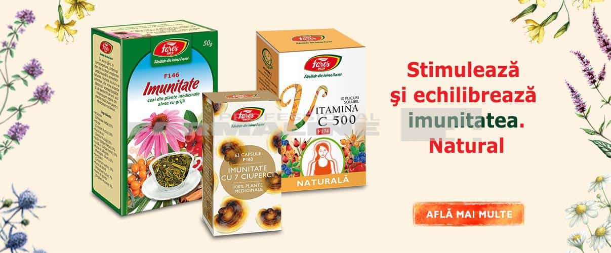 Descriere -conferă o bună imunitate;- susţine procesele de apărare ale organismului faţă de microorganismele potenţial patogene;- stimulează producerea de interferon în organism;- adaptogen, tonic general, susţine adaptarea organismului la stres, suprasolicitare fizică şi psihică;- ajutor în stări de oboseală persistentă, convalescenţă;- protector hepatic şi renal;- antioxidant.  Compozitie Extract uscat 10:1 de Reishi (Ganoderma tsugae) standardizat în min. 30% polizaharide 96 mg.Extract uscat de Shiitake (Lentinula edodes) standardizat în min. 30% polizaharide 96 mg.Extract uscat 10:1 de Maitake (Grifola frondosa) standardizat în min. 30% polizaharide 96 mg.Enokitake (Flammulina velutipes) 48 mg.Tremella fuciformis 48 mg.Extract uscat de Polyporus umbellatus standardizat în min. 30% polizaharide 48 mg.Ghebe de miere (Armillaria mellea) 48 mg.Mod de administrareCopii 10-14 ani: câte 2 capsule pe zi, la o oră după masă.Copii de peste peste 14 ani şi adulţi: câte 1 capsulă de 3 ori pe zi, la o oră după masă. Ultima administare să nu fie mai târziu de ora 18.Dacă este nevoie de un efect mai puternic se pot administra până la 6 capsule pe zi, la recomandarea medicului sau a farmacistului.Durata curei este de 3-6 săptămâni. Cura se poate repeta după o pauză de o lună.ProducatorFaresMod de prezentareFlacon 63 capsule + Cutie 10 cpr.+Ceai