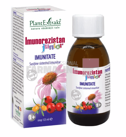 Descriere- rezistența organismului este importantă mai ales în perioadele cu expunere crescută la virusuri, bacterii și răceli, în stări de convalescență și pentru creșterea armonioasa a copilului;- rezistența organismului este crescută atunci când sistemul imunitar este sănătos;- ingredientele naturale din compoziția Imunorezistan Junior Imunitate sirop contribuie la funcționarea optimă a sistemului imunitar (Echinacea, Măceș, Cătină);- contribuie la susținerea rezistenței organismului, fiind o sursă naturală de vitamina C (Măceș, Cătină);- in plus, Măceșul și Coacăzul-negru, contribuie la fortificarea organismului și la menținerea stării de bine generale.Compozitie100 g conțin: apă purificată, suc stabilizat și standardizat din herba de echinacea purpurea (1:3) 20 g, glicerină, siropuri cu zahăr invertit din fructe proaspete de: rosa canina (Măceș) 10 g, vaccinium myrtillus (Afin) 10 g, hippophae rhamnoides (Cătină) 10 g și ribes nigrum (Coacăz negru) 10 g, extract din mlădițe de măceș rosa canina MG (extract gemoterapic 1:20) 2 g, extract din muguri de cătină hippophae rhamnoides MG (extract gemoterapic 1:20)2 g, conservant: sorbat de potasiu.Conține 4,5 %vol. alcool etilic de cereale. Valoare energetică: 7,03kJ/g respectiv 1,68 kcal/g.Plantă din cultură ecologică.Mod de administrareCopii 1 – 2 ani: câte 3 ml sirop Imunorezistan Junior Imunitate de 2 ori pe zi.Copii 3 – 4 ani: câte 3 ml sirop Imunorezistan Junior Imunitate de 3 ori pe zi.Copii 5 – 7 ani: câte 5 ml sirop Imunorezistan Junior Imunitate de 3 ori pe zi.Copii cu vârsta peste 7 ani: câte 5 ml sirop Imunorezistan Junior lmunitate de 5 ori pe zi.Utilizarea se recomandă într-un ciclu de 4 zile urmate de 4 zile pauză, pentru o perioada de 4 -6 săptămâni. Folosiți calendarul evidenței utilizarilor. A se agita înainte de folosire. A nu se depăși doza recomandată pentru consumul zilnic.ProducatorPlantExtraktMod de prezentareFlacon 125 ml