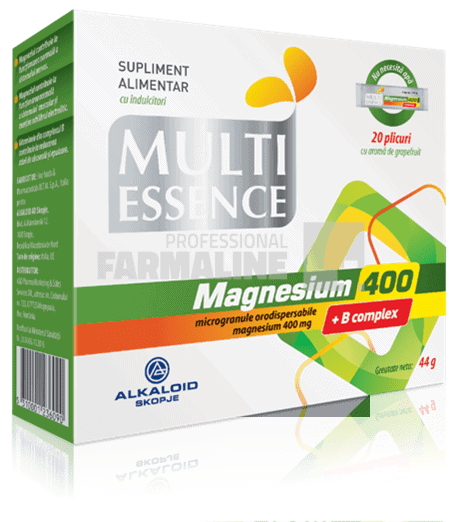 DescriereMagnesium 400 + B-complex este un supliment alimentar care conține magneziu și un complex de vitamine B, asigurând nivelul lor optim în cazul deficitului nutrițional. Magneziul este un mineral necesar multor procese funcționale și pentru menținerea stării de sănătate a organismului. În organismul uman, magneziul se găsește în oase și țesuturi moi și este necesar pentru producerea de energie și pentru metabolismul osos. Nivelul de magneziu seric este de obicei constant, dar poate scădea în timpul sarcinii din cauza creșterii volumului plasmei. Magneziul participă la numeroase procese care afectează funcția musculară, incluzând absorbția oxigenului, producerea de energie și echilibrul electrolitic. Dat fiind faptul că organismul uman nu poate produce singur magneziu este necesară suplimentarea regulată în regimul alimentar. Lipsa magneziului poate duce la scăderea imunității organismului. Vitaminele B sunt necesare pentru producerea de energie, precum și pentru sinteza de noi celule și reînnoirea celor deteriorate.Vitamina B1 (tiamina) contribuie la funcționarea normală a sistemului nervos, la menținerea sănătății psihice și la funcționarea normală a inimii. Vitamina B2 (riboflavina) contribuie la metabolismul energetic normal, la funcționarea normală a sistemului nervos și la protejarea celulelor împotriva stresului oxidativ. Vitamina B6 contribuie la metabolismul energetic normal, la funcționarea normală a sistemului nervos și a sistemului imunitar, la menținerea sănătății psihice, la metabolismul normal al proteinelor și glicogenilor și la reducerea oboselii și extenuării. Vitamina B12 contribuie la menținerea sănătății psihice și la reducerea oboselii și extenuării. Vitamina B12 contribuie la procesul de diviziune celulară. CompozitieIndulcitor: sorbitol (din porumb sau grâu), oxid de magneziu, nicotinamidă (Vitamina PP), corector de aciditate: acid citric, D-pantotenat de calciu (acid pantotenic), aromă de grapefruit, ciancobalamină (vitamina B12), sare sodică de riboflavin-5-fosfat (vitamina B2), hidroclorură de piridoxină (vitamina B6), hidroclorură de tiamină (vitamina B1), aromă de mentă, îndulcitori: sucraloză și zaharină sodică; acid pteroil-monoglutamic (folat), D-biotină (vitamina H); agent antiaglomerant: dioxid de siliciu.Mod de administrareAdulți: Dizolvați un plic pe zi, direct în gură. Precautii: A nu se depăși doza recomandată pentru consumul zilnic. Depășirea dozei zilnice recomandate poate avea efect laxativ. Produsul este un supliment alimentar și nu trebuie să înlocuiască o dietă variată și echilibrată și un stil de viață sănătos. ProducatorAlkaloidMod de prezentareCutie cu 20 plicuri