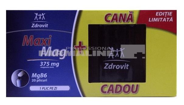 DescriereMagneziul are efect calmant(scade excitabilitatea fibrelor neuro-musculare,atat netede cat si striate). Contracareaza stresul si are efect protector asupra miocardului. Magneziul este esential in mentinerea echilibrului electrolitic al organismului uman si, in plus, participa la dievrse procese metabolice in organism.Vitamina B6 adaugata magneziului creste asimilarea acestuia in organism, asigurandu-i o concentratie mare in plasma si o scadere a eliminarii prin urina.Asimilarea magneziului in organism este afectata de dietele bogate in grasimi si in proteine.Asimilarea magneziului in organism este redusa din varii cauze:- Cure de slabire dese sau pe perioade lungi.- Diete alimentare bogate in fibre.- Diete bogate in calciu sau calciu consumat o perioada lunga de timp in vederea prevenirii osteoporozei.CompozitieAcid citric, carbonat de magneziu, citrat trisodic, izolmalt, ciclamat de sodiu, aroma de lamaie, zaharina sodica, clorhidrat de piridoxina, riboflavin-5-fosfat de sodiu; magneziu 375mg; vitamina B6 1.4mg.Mod de administrare1 plic pe zi, dizolvat intr-un pahar cu apa.ProducatorZdrovitMod de prezentareCutie cu 20 plicuri + Cana